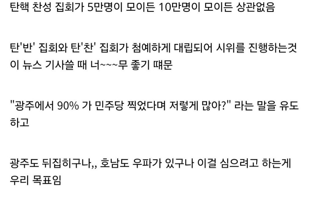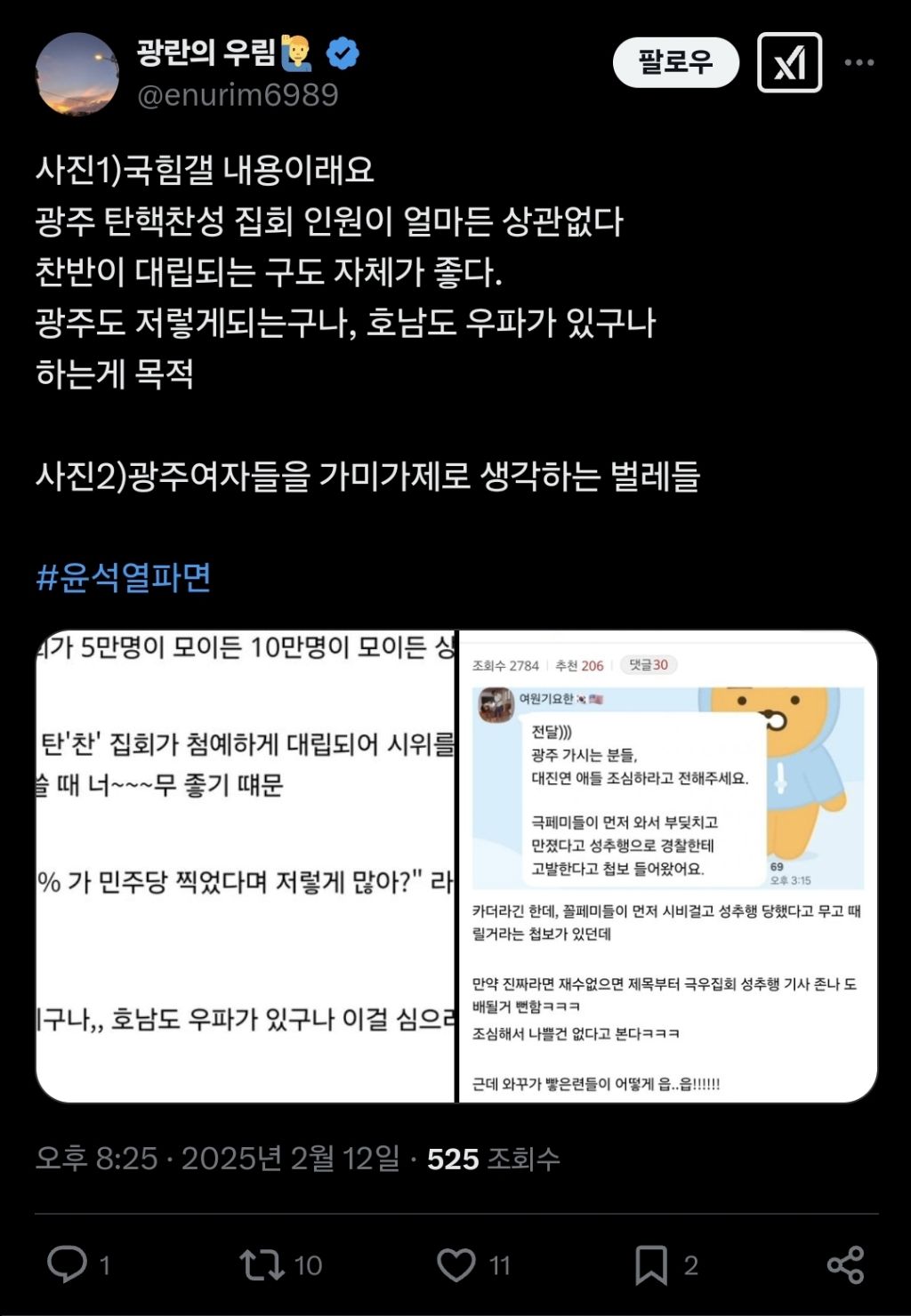 [칵.cxxx]국힘갤에 올라온 이번 주 토요일 광주 극우 집회 관련 글 작성자도니(살)|작성시간25.02.13|조회수2,652 목록 댓글 16 글자크기 작게가 글자크기 크게가 출처: 여성시대 도니(살), https://x.com/enurim6989/status/1889636948177809580?t=-TZLj4Lg-oLgl18IV8Kfpw&s=19 ⏫️ 얘네 목표⏫️ 그리고 저런 새끼들이 이야기하는 광주.내고향 광주가 이렇게 조롱당하고 더럽혀지는걸 두고볼 수만은 없어서이번주 집회는 광주로 간다... 다음검색 현재 게시글 추가 기능 열기 북마크 공유하기 신고 센터로 신고 댓글 댓글 16 댓글쓰기 답글쓰기 댓글 리스트 작성자한성백제역 | 작성시간 25.02.13 진짜 개열받는다 작성자사골미역국 | 작성시간 25.02.13 아는 개독아주머니 광주 집회금지흔 광주시장 욕하던데 진짜 지들끼리 공유 존나 하나봐 작성자추소정 | 작성시간 25.02.13 될 수 있으면 이번주는 광주로 화력 모아져야할듯.. 작성자초당수옥수 | 작성시간 25.02.13 재기해라 ㅅㅂ 작성자세상에ㄱㅐ자식이너무많다 | 작성시간 25.02.13 너무 걱정된다… 댓글 전체보기