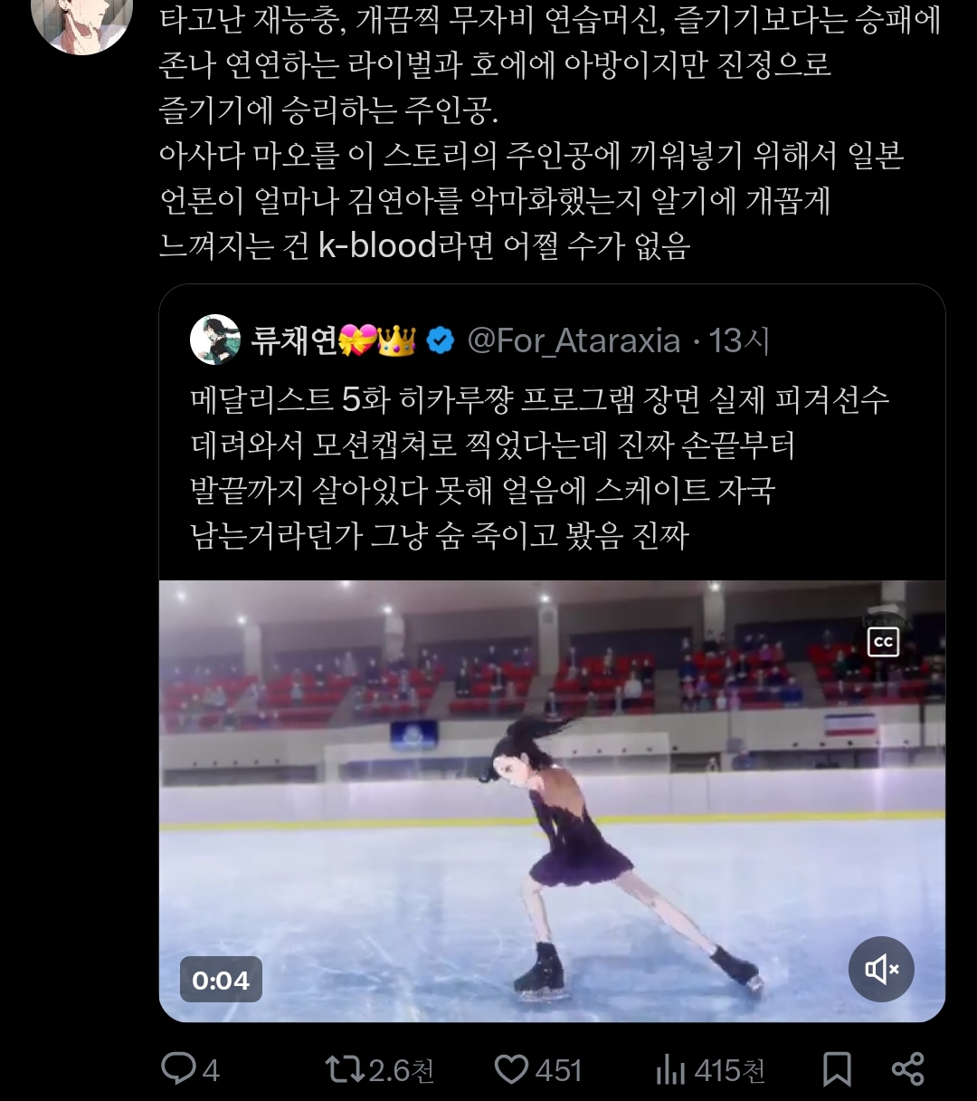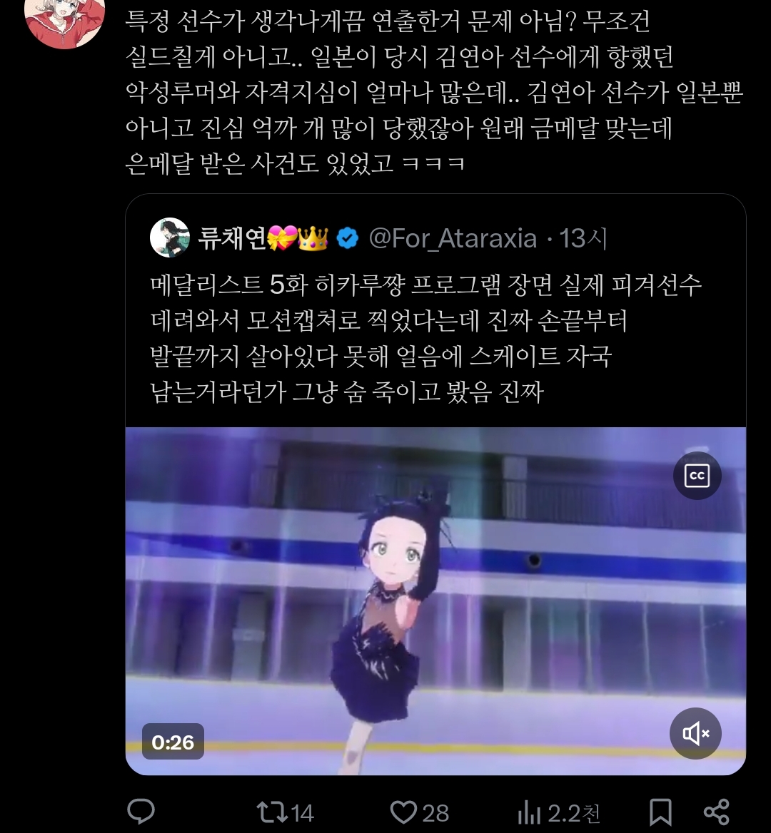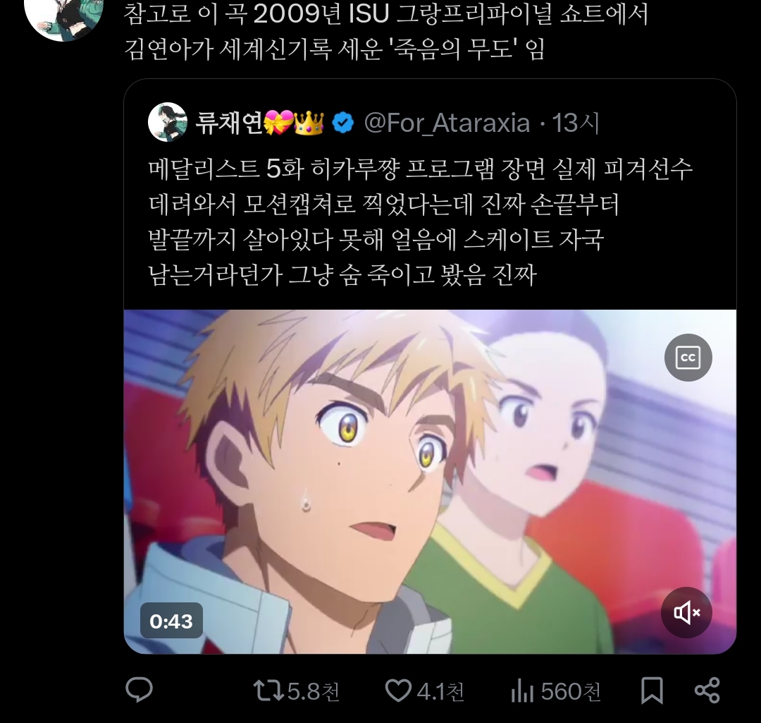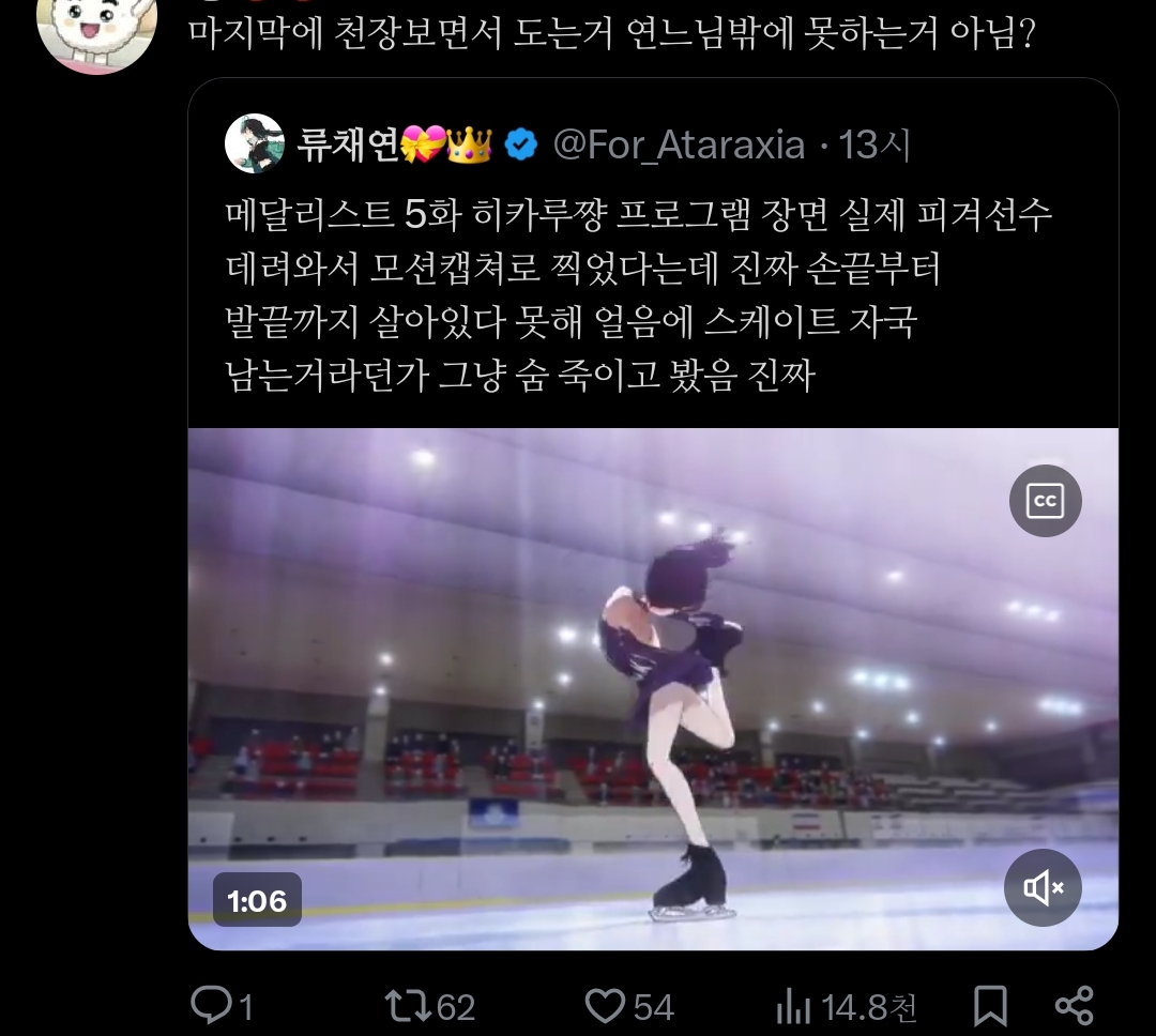 메달리스트 5화 히카루쨩 프로그램 장면 실제 피겨선수 데려와서 모션캡쳐로 찍었다는데 진짜 손끝부터 발끝까지 살아있다 못해 얼음에 스케이트 자국 남는거라던가 그냥 숨 죽이고 봤음 진짜pic.twitter.com/PfWpsc4fOg