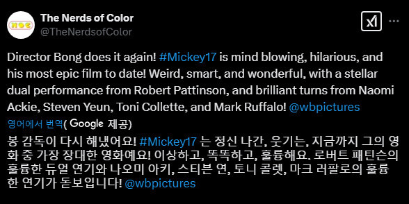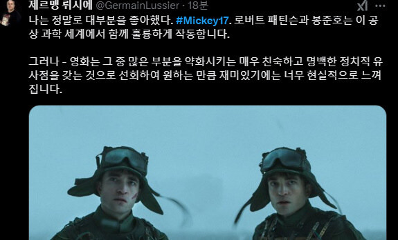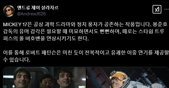 [흥미돋]봉준호 신작 <미키 17> 월드 프리미어 평 모음 작성자귤토끼이|작성시간25.02.14|조회수17,822 목록 댓글 42 글자크기 작게가 글자크기 크게가 출처: https://theqoo.net/square/3612194639 다음검색 현재 게시글 추가 기능 열기 북마크 공유하기 신고 센터로 신고 댓글 댓글 42 댓글쓰기 답글쓰기 댓글 리스트 작성자피자붕어빵 | 작성시간 25.02.14 기대된다 작성자단호박피크민 | 작성시간 25.02.14 헐 재밌나보네 작성자champagnesupernova | 작성시간 25.02.14 당장개봉해 작성자Resolution | 작성시간 25.02.14 넘 궁금해... 평 안좋아도 가서 볼거임 작성자문상태 | 작성시간 25.02.14 빨리 보고싶다 개봉날 바로 봐야지 댓글 전체보기