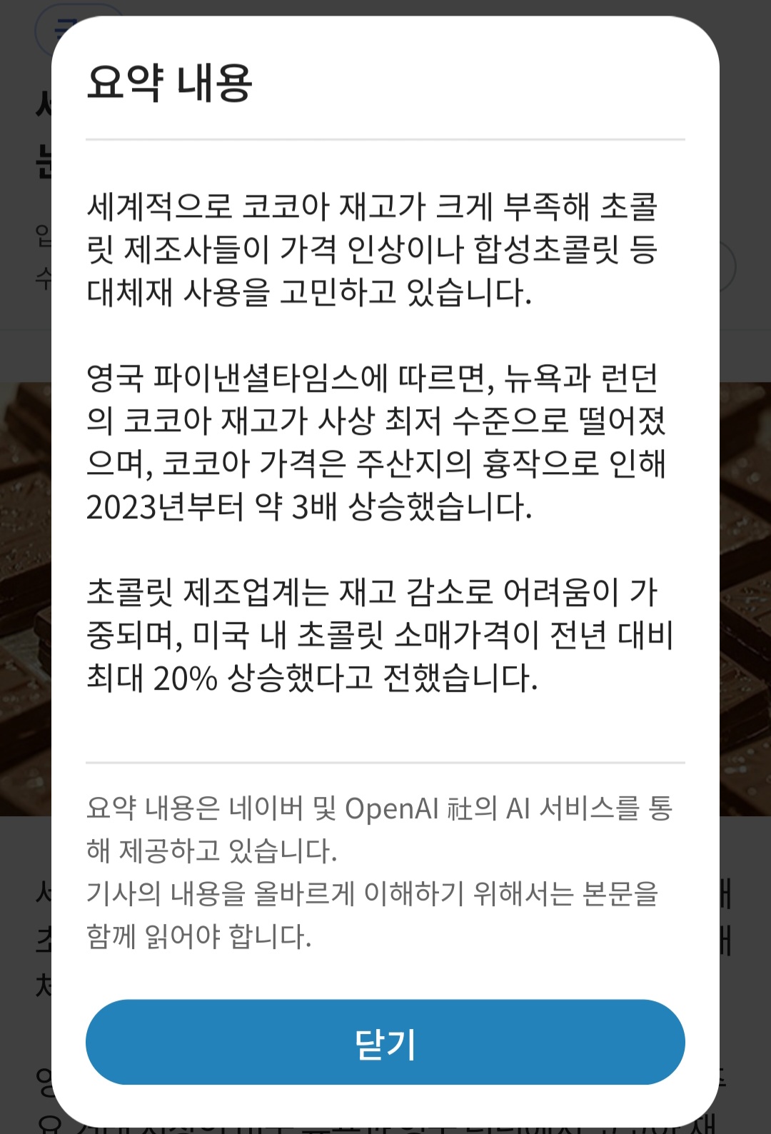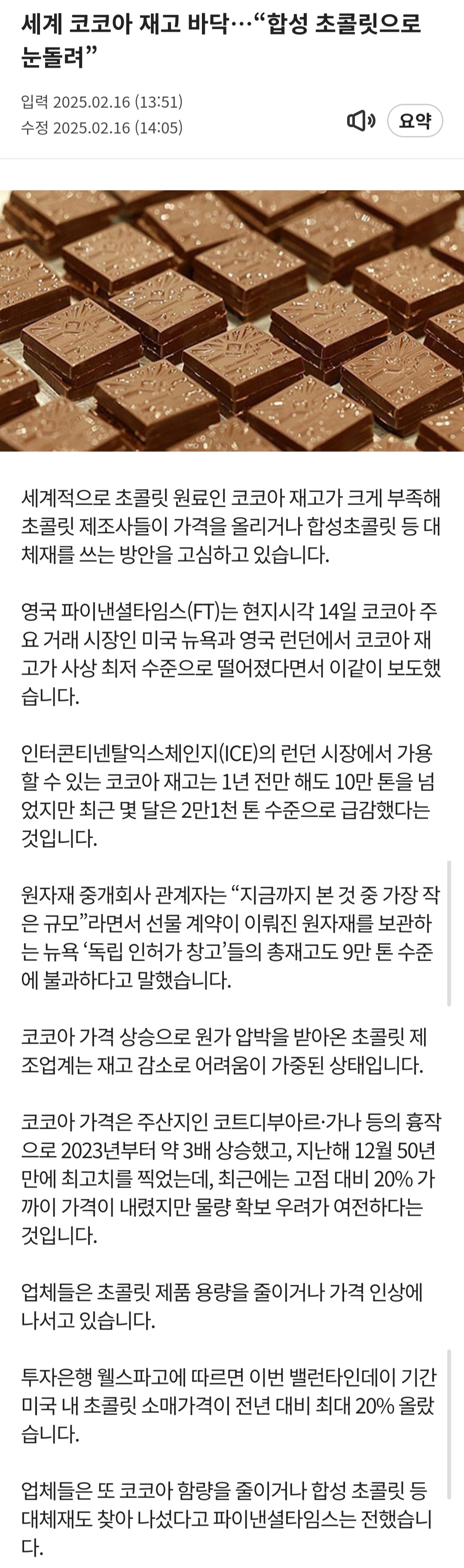 [여시뉴스데스크]세계 코코아 재고 바닥…“합성 초콜릿으로 눈돌려” 작성자냥냥펀치°|작성시간25.02.18|조회수8,063 목록 댓글 41 글자크기 작게가 글자크기 크게가 출처: https://news.kbs.co.kr/news/mobile/view/view.do?ncd=8177222세계 코코아 재고 바닥…“합성 초콜릿으로 눈돌려”세계적으로 초콜릿 원료인 코코아 재고가 크게 부족해 초콜릿 제조사들이 가격을 올리거나 합성초콜릿 등 ...news.kbs.co.kr 다음검색 현재 게시글 추가 기능 열기 북마크 공유하기 신고 센터로 신고 댓글 댓글 41 댓글쓰기 답글쓰기 댓글 리스트 작성자행복한 고양이 땅콩 | 작성시간 25.02.18 안돼초콜릿 ㅠㅠ 작성자리바이병장 | 작성시간 25.02.18 안도ㅐ 작성자피노누아 | 작성시간 25.02.18 와진짜 나중에 마약마냥 비싸게팔릴ㄹ듯 내 마약이라고 ㅠ 작성자코나오쬬쬽 | 작성시간 25.02.18 랩 코코아좀… 작성자버드 | 작성시간 25.02.18 먼 훗날 이게 초콜릿이란다 하면서 사진만 남은 초콜릿을 보여주겠지 영원히 맛은 모른 채 댓글 전체보기