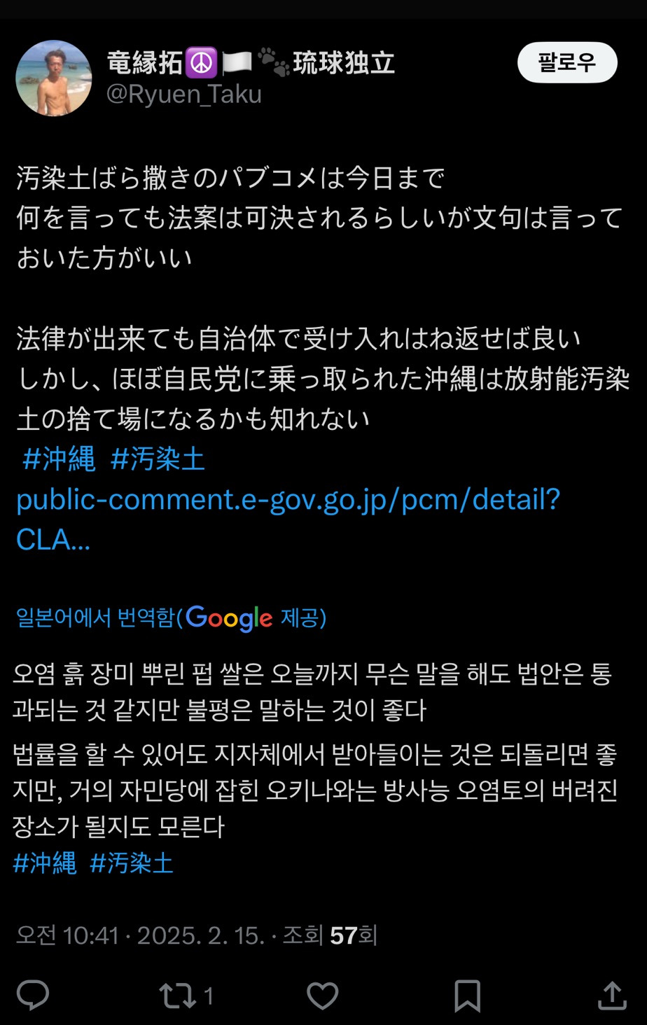 + 오키나와에도 방사능오염토를 매립하거나 폐기할 예정인가봐.