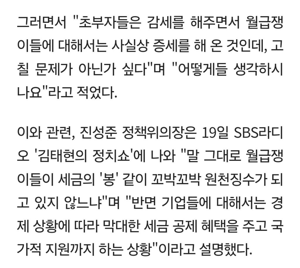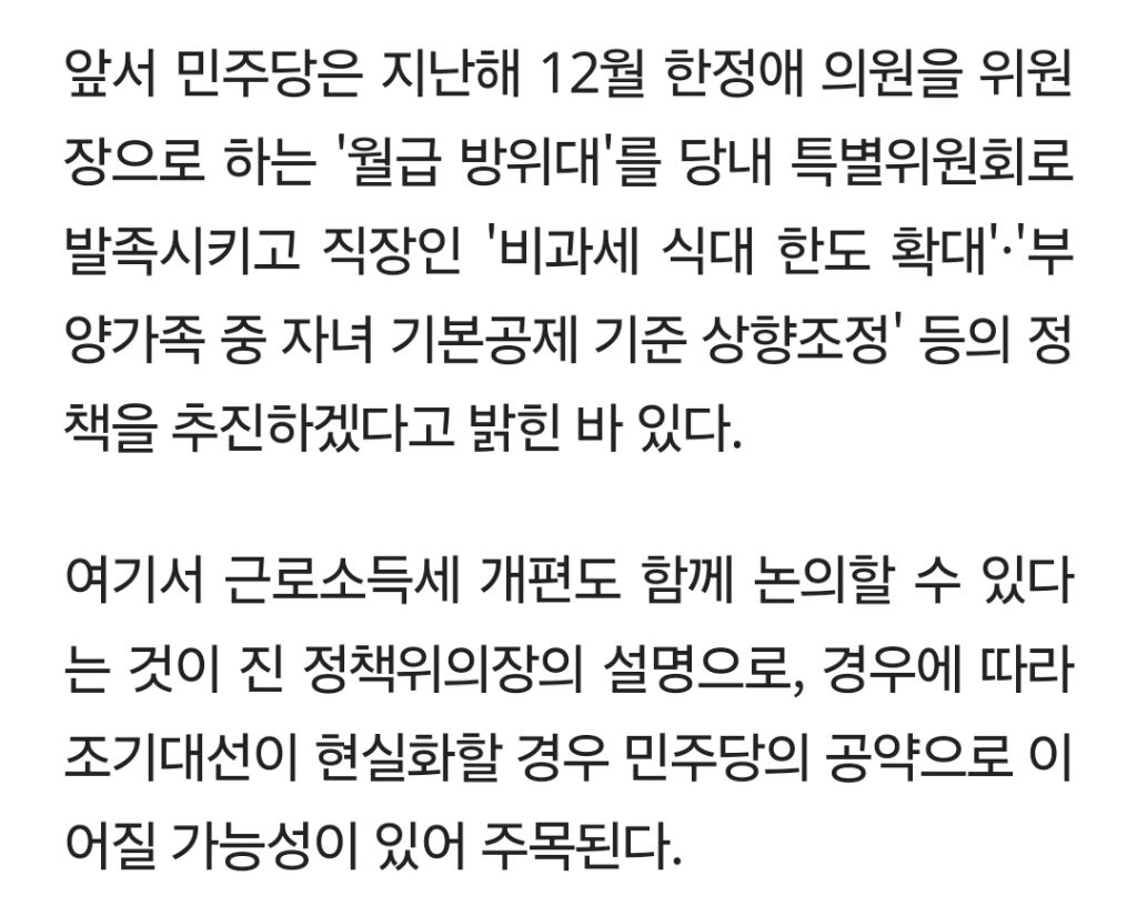 [여시뉴스데스크]민주, 근로소득세 개편 검토…이재명 "월급쟁이는 봉인가" 작성자깜빡해|작성시간25.02.19|조회수1,282 목록 댓글 16 글자크기 작게가 글자크기 크게가 출처: 여성시대 (깜빡해)https://news.nate.com/view/20250219n11966?mid=n1006 다음검색 현재 게시글 추가 기능 열기 북마크 공유하기 신고 센터로 신고 댓글 댓글 16 댓글쓰기 답글쓰기 댓글 리스트 작성자말리부오렌지 | 작성시간 25.02.19 제발 ㅠㅠ 작성자kd84 | 작성시간 25.02.19 오 대박. 부자 대기업 증세하고 서민은 좀 봐주 작성자둥딴딴 | 작성시간 25.02.19 이재명이 대통령인 세상 하루빨리 겪어보고 싶다 ㅠ 작성자지원합니당 | 작성시간 25.02.19 나으 아버디 작성자브랄라 | 작성시간 25.02.19 맞아 맞아 댓글 전체보기
