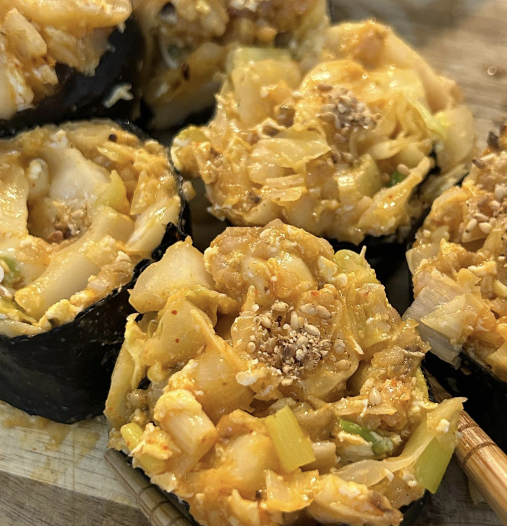 6. 볶음 음식이 조금 식으면, 김밥용 김에 올려 치즈를 얹고 말아주세요.