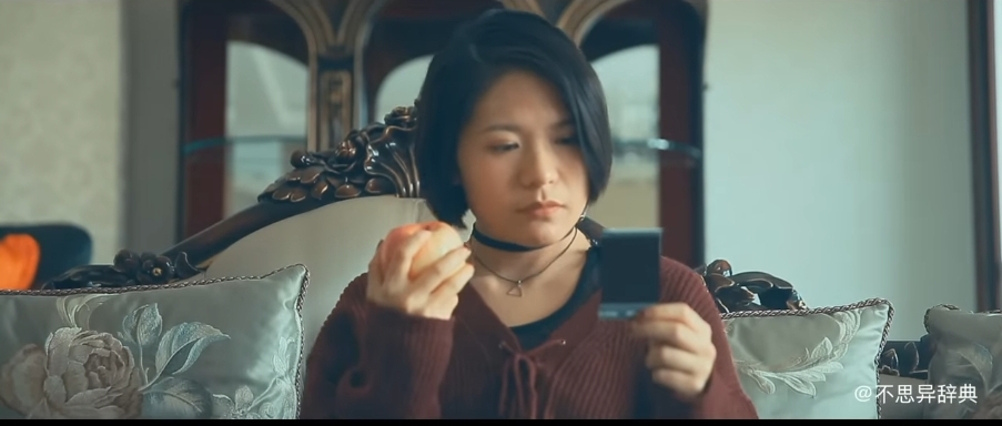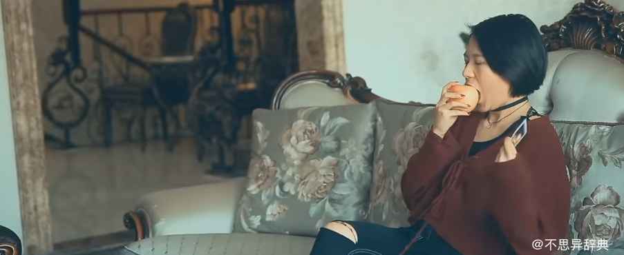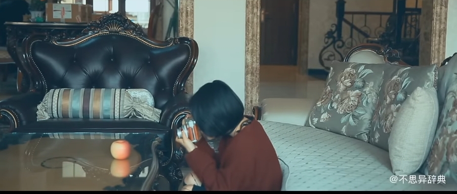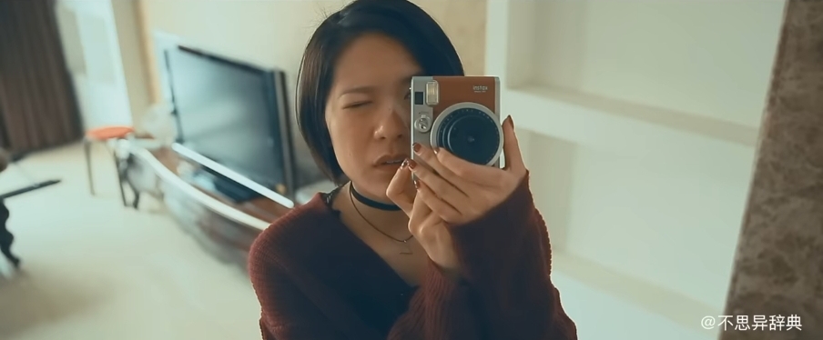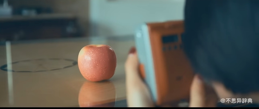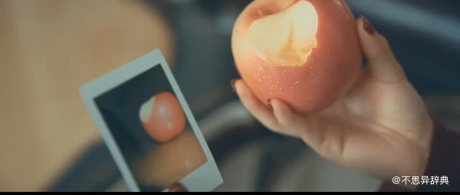 카메라로 사과를 찍고 한입 베어 문다