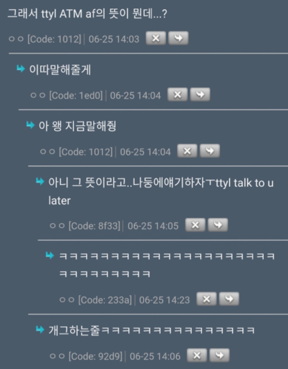 [흥미돋]그래서 ttyl 뜻이 뭔데...? 작성자열심히햄마|작성시간25.02.20|조회수20,725 목록 댓글 60 글자크기 작게가 글자크기 크게가 출처: 여성시대 열심히햄마 그냥 보세요 다음검색 현재 게시글 추가 기능 열기 북마크 공유하기 신고 센터로 신고 댓글 댓글 60 댓글쓰기 답글쓰기 댓글 리스트 작성자쏘유캔럽미 | 작성시간 25.02.20 ㅋㅋㅋㅋㅋㅋㅋㅋㅋㅋㅋ아 웃기다ㅋㅋㅋㅋㅋㅋㅋ 작성자아휴수박먹고배불르다 | 작성시간 25.02.20 이새이름이.뭐에요? 작성자오복가위 | 작성시간 25.02.20 ㅋㅋㅋㅋㅋㅋㅋㅋ애교쩌넼ㅋㅋㅋㅋㅋㅋㅋ 작성자이츠실제상황 | 작성시간 25.02.20 ㅋㅋㅋㅌㅌㅌㅋㅋㅌㅌㅌ 노예분성함이? ㅠ 작성자꿀티 | 작성시간 25.02.20 탐나나! 댓글 전체보기