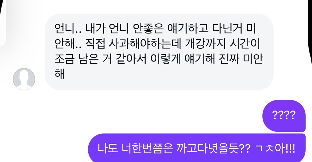 아니 존나 갑자기 디엠으로 자기가 내뒷담깟다고..? 미안하다고 디엠와서 (내친구가 들엇나... 친구가 말해주기전에 먼저 선수친건지 아직도 모르겟음;;;) 이렇게 답장햇는데 지금 전화로 개발작함 뭐지...