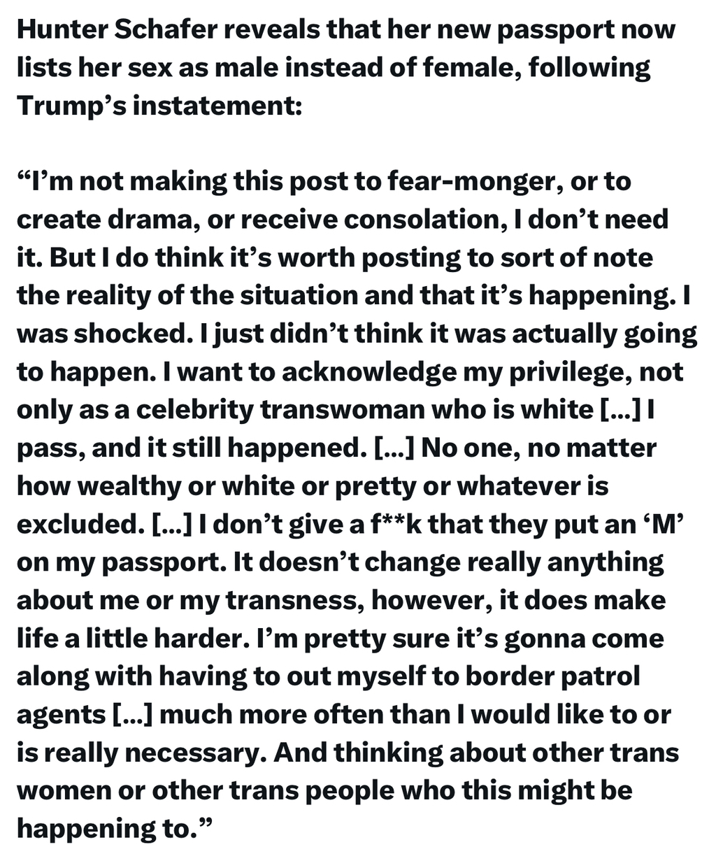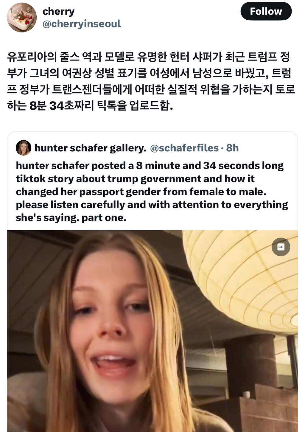 유포리아의 줄스 역과 모델로 유명한 헌터 샤퍼가 최근 트럼프 정부가 그녀의 여권상 성별 표기를 여성에서 남성으로 바꿨고, 트럼프 정부가 트랜스젠더들에게 어떠한 실질적 위협을 가하는지 토로하는 8분 34초짜리 틱톡 업로드