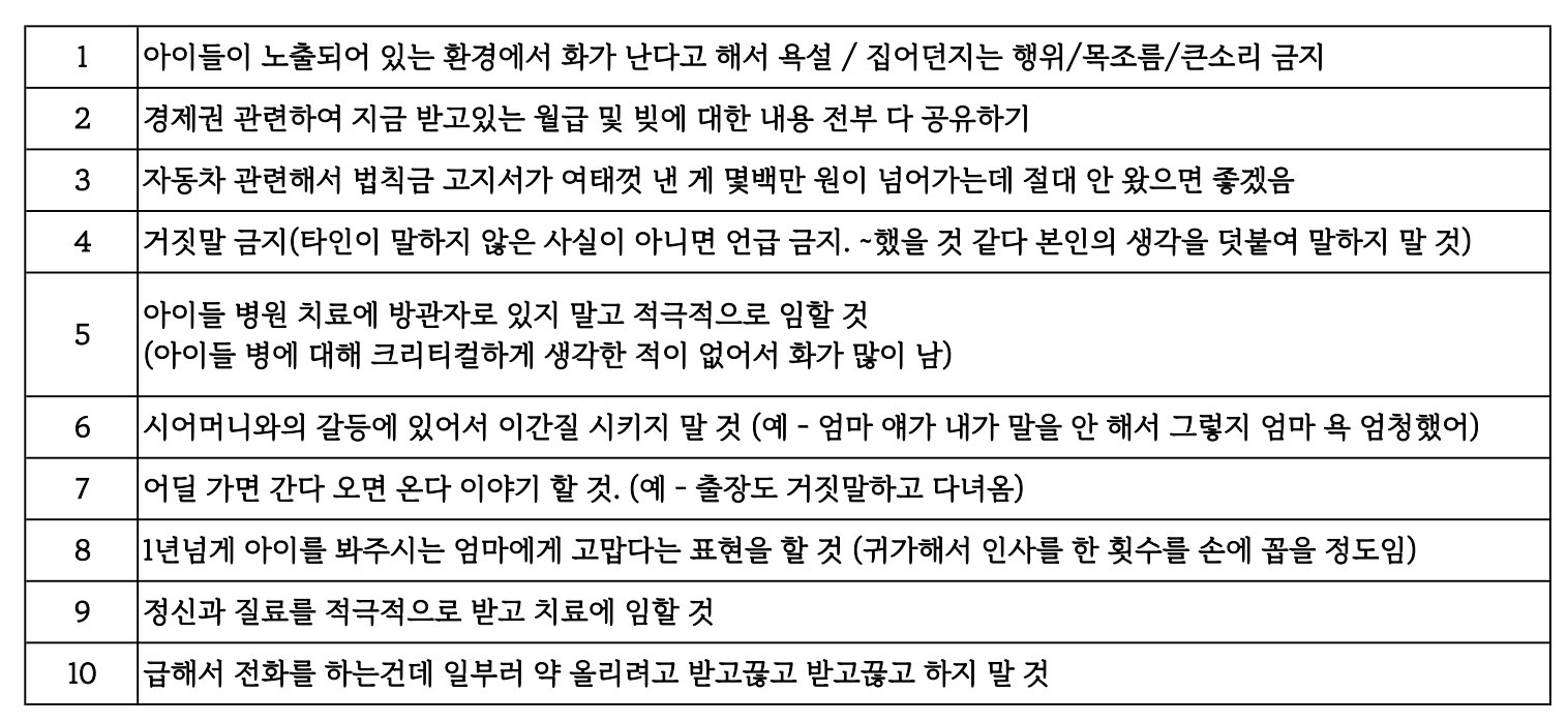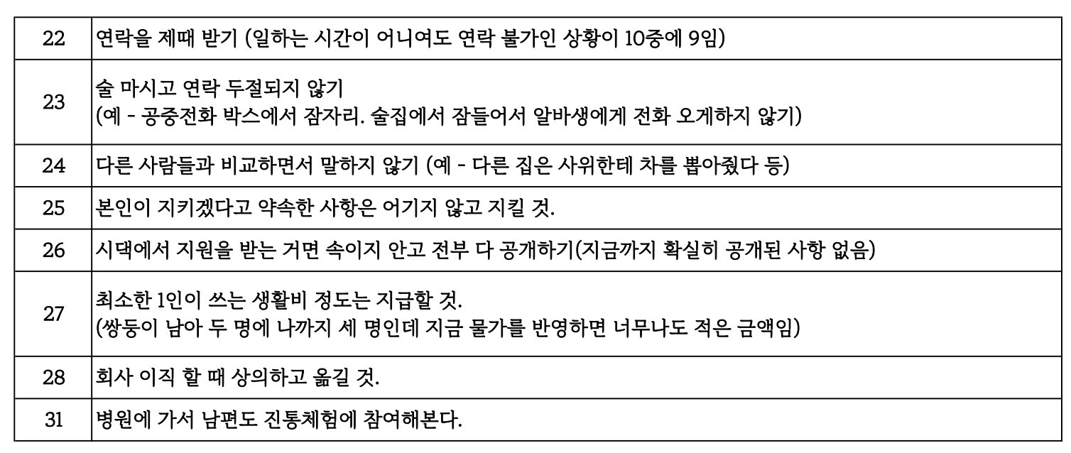 24. 다른 사람들과 비교하면서 말하지 않기 (예 - 다른 집은 사위한테 차를 뽑아줬다 등)