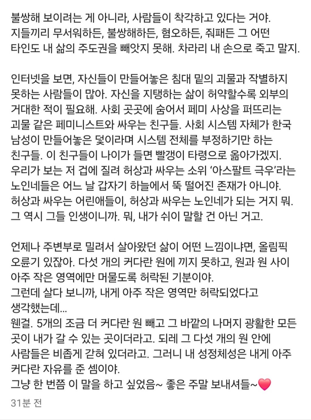 그리고 개인적으로 나는 많은 여성들이 문제를 인식하고 부정하는 것만으로도 큰 의의가 있고 페미니즘의 역할이라고 생각하는 입장이야!( 물론 내가 나가서 직접적으로 여성 인권 시위를 하거나 개인 sns에 글을 올릴 베짱은 못 되서 그런 것도 있겠지만ㅠ) 어쨌든 급진적이든 소극적이든 페미니즘은 다 의미가 있다고 생각해~ 겉보기에는 아무 행동 않는 소극적인 부정이어도 투표에 변화는 생기는 것처럼! 그런 의미에서 나는 '아스팔트 극우'들과 비교되는 거에 반대했어!