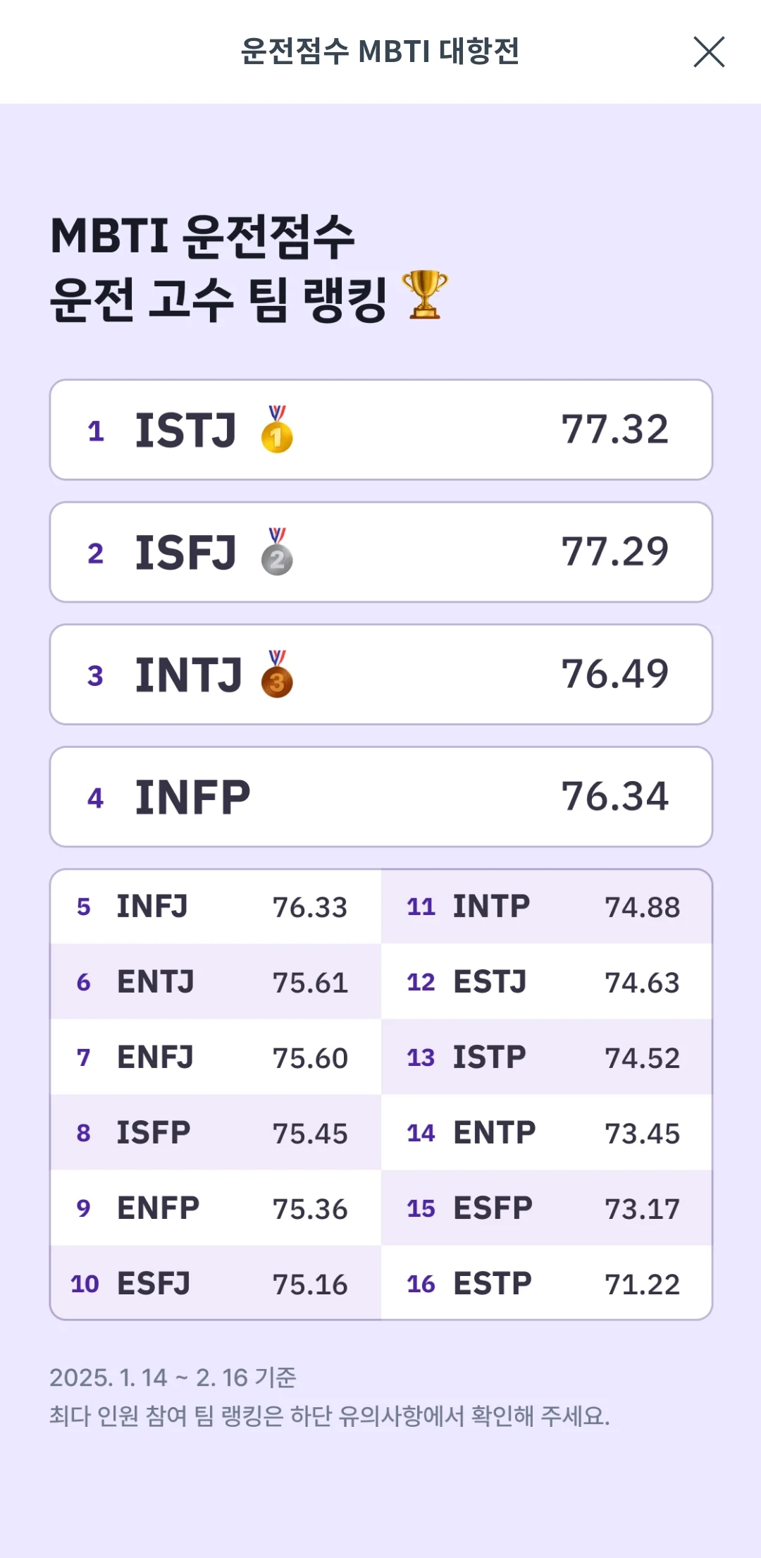 [흥미돋]쏘카에서 집계한 mbti별 운전 점수 작성자악귀|작성시간25.02.22|조회수53,771 목록 댓글 184 글자크기 작게가 글자크기 크게가 출처: 여성시대 악귀IxxJ가 상위권이고반대로 ExxP가 점수 낮은듯 다음검색 현재 게시글 추가 기능 열기 북마크 공유하기 신고 센터로 신고 댓글 댓글 184 댓글쓰기 답글쓰기 댓글 리스트 작성자NETFLIX | 작성시간 25.02.24 ㅋ esfp 임...ㅋㅋㅋ 이미지 확대 작성자도파민 | 작성시간 25.02.24 esfp...그래도 무사고 1n년임... 딱지 끊긴적도 없어... 이미지 확대 작성자17:08 | 작성시간 25.02.25 아 그래 내 주변 istj들도 하나같이 운전 잘하드랔ㅋㅋㅋㅋㅋㅋㅋㅋ 뭐지 비결이 도대체..?!?! 작성자young & rich | 작성시간 25.02.26 운전 안 하지만 그럴 줄 알았어 작성자steal like an artist | 작성시간 25.03.14 오 상위 다 i네 댓글 전체보기