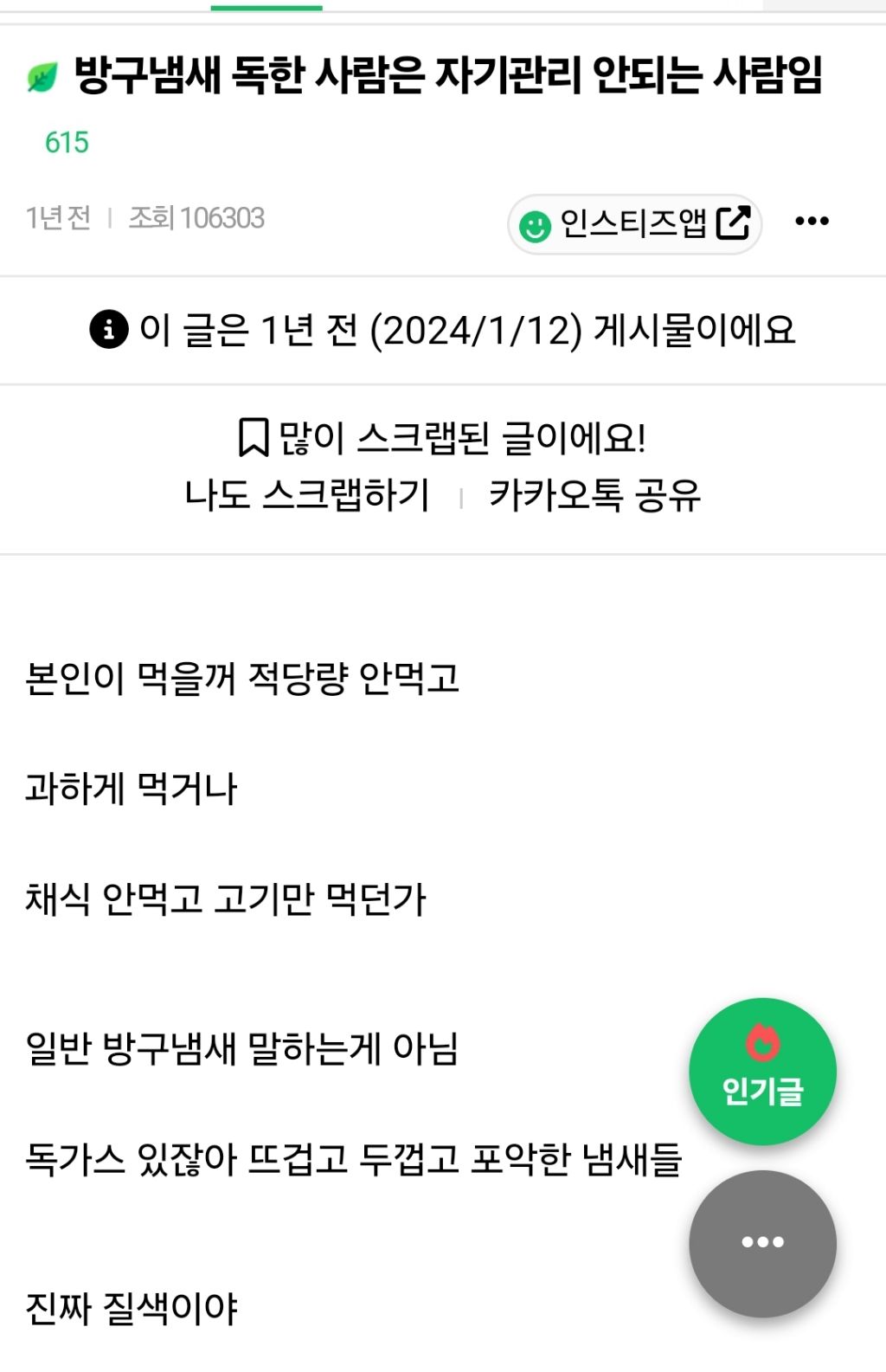 [흥미돋]방구냄새 독한 사람은 자기관리 안되는 사람임 작성자참치마ㅇ|작성시간25.02.23|조회수55,600 목록 댓글 116 글자크기 작게가 글자크기 크게가 출처: https://naver.me/xSNRagfL[잡담] 방구냄새 독한 사람은 자기관리 안되는 사람임 - 인스티즈(instiz) 일상 카테고리본인이 먹을꺼 적당량 안먹고 과하게 먹거나 채식 안먹고 고기만 먹던가 일반 방구냄새 말하는게 아님 독가스 있잖아 뜨겁고 두껍고 포악한 냄새들 진짜 질색이야www.instiz.net 다음검색 현재 게시글 추가 기능 열기 북마크 공유하기 신고 센터로 신고 댓글 댓글 116 댓글쓰기 답글쓰기 댓글 리스트 작성자에반 벅 버클리 | 작성시간 25.02.24 나를 욕하지말라 작성자microcosm | 작성시간 25.02.24 거 너무하네 작성자포도맛나니 | 작성시간 25.02.24 월요일 아침부터 방귀 얘기로 텐션 올라가는 스스로가 참 웃기고 싫다 작성자NETFLEX | 작성시간 25.02.25 변비띿오ㅠ 작성자오렌지담요 | 작성시간 25.02.25 두껍고 포악하대 ㅋㅋㅋㅋㅋㅋ 묘사 완전 웃겨 ㅋㅋㅋㅋㅋㅋㅋㅋㅋㅋㅋㅋㅋ 댓글 전체보기