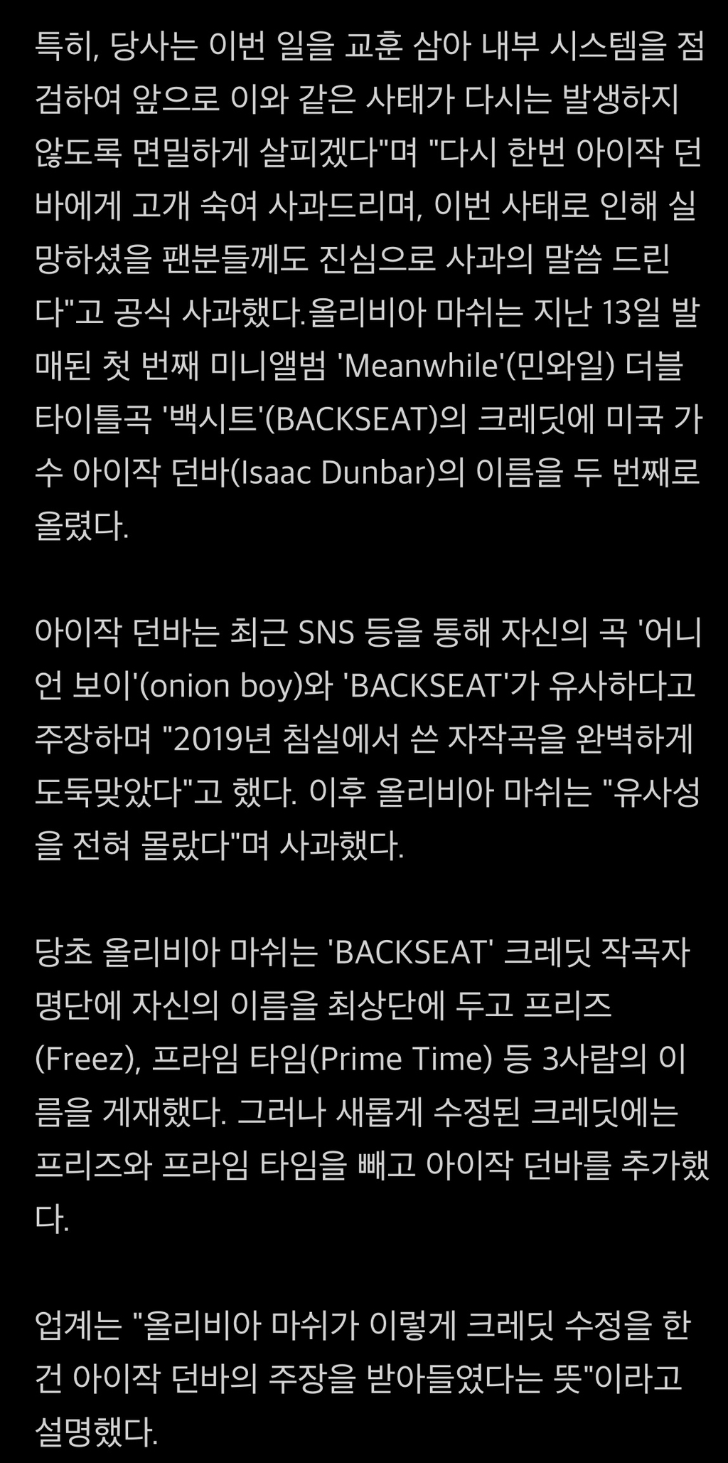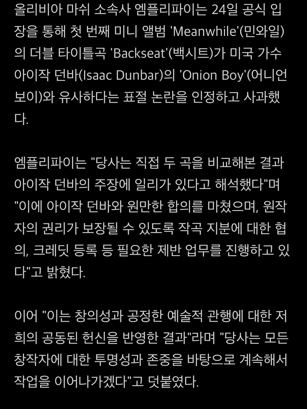 [여시뉴스데스크]올리비아 마쉬, '백시트' 표절 인정 "원작자와 합의 마쳤다" [종합] 작성자운동화찾아주는여시|작성시간25.02.25|조회수15,972 목록 댓글 26 글자크기 작게가 글자크기 크게가 출처: https://m.entertain.naver.com/article/312/0000701927올리비아 마쉬, '백시트' 표절 인정 "원작자와 합의 마쳤다" [종합]한눈에 보는 엔터 소식m.entertain.naver.com 다음검색 현재 게시글 추가 기능 열기 북마크 공유하기 신고 센터로 신고 댓글 댓글 26 댓글쓰기 답글쓰기 댓글 리스트 작성자둥구당당둥당당 | 작성시간 25.02.25 노래 전체가 다 어디서 들어본 것 같긴 하던데 더 실력 키워서 레퍼런스에 의존하지 않고 곡 쓰길 작성자악악악악크크 | 작성시간 25.02.25 응원해용 굿굿😍😍 작성자띠로리라리라 | 작성시간 25.02.25 인정했으니 다음부턴 그러지 않으면 됌~ 작성자새콤달콤핑 | 작성시간 25.02.25 깔끔하다 굿굿 작성자Luna Astra | 작성시간 25.02.25 와우 진짜 깔끔하게 잘했네 앞으로 더 잘해주길 댓글 전체보기