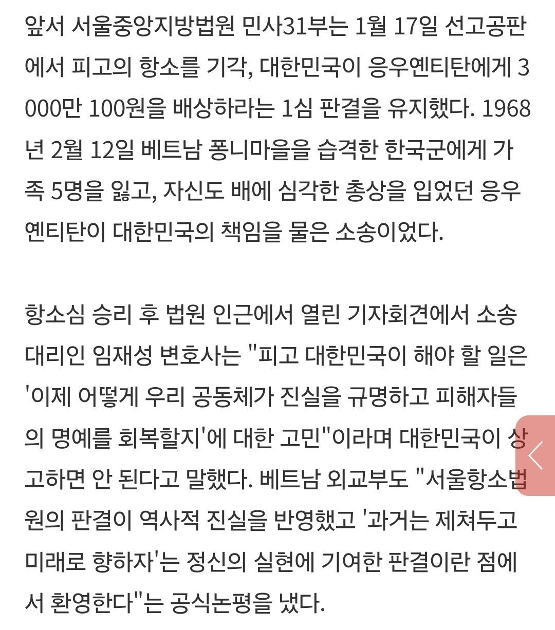 쟁점은 베트남전 당시 일어난 퐁니-퐁넛 학살 사건이며 원고의 승소 증거로는