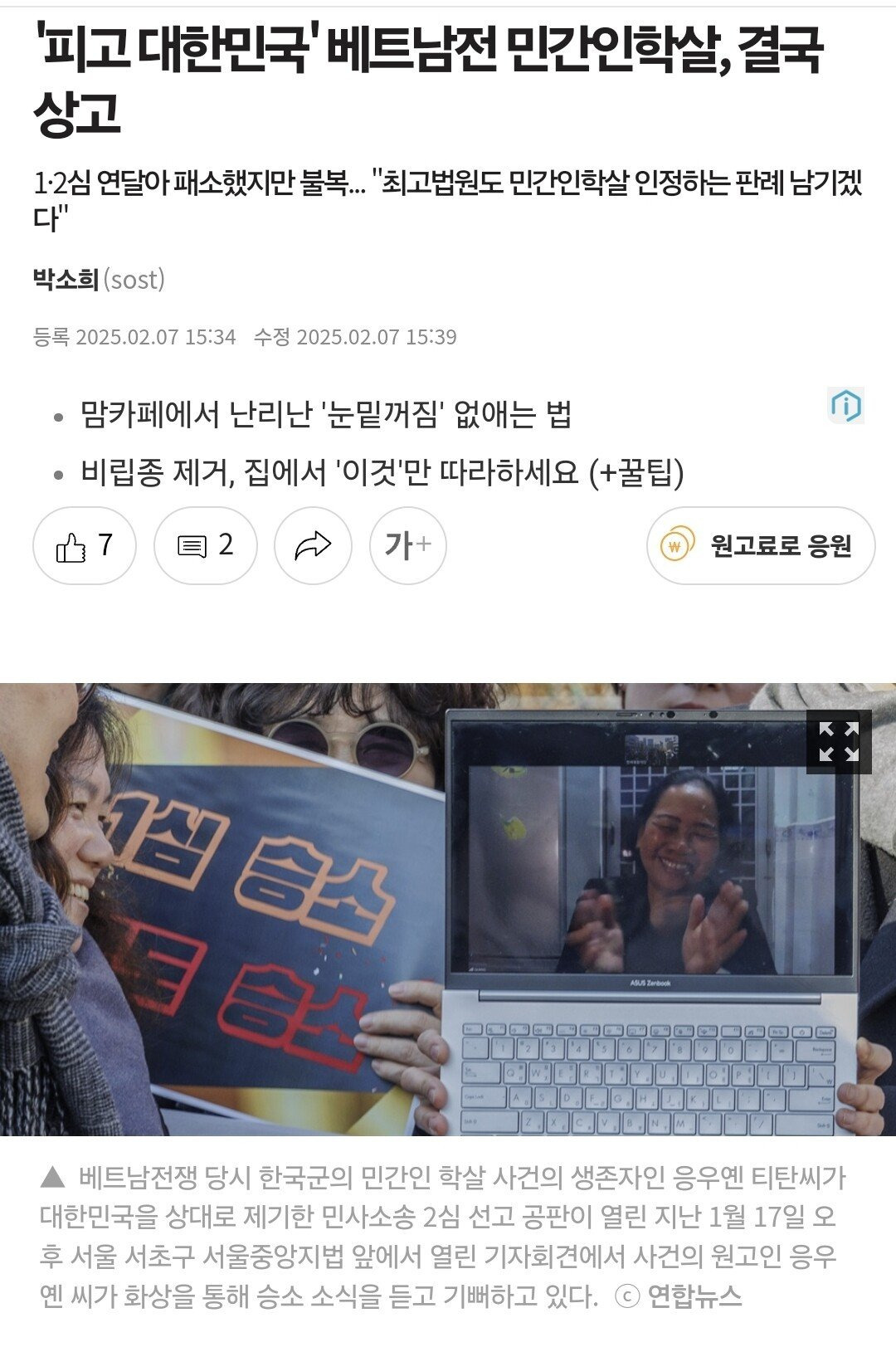 3주전 항소까지 대한민국이 패배했고 이제 상고만 남음. 1심과 2심 모두 원고인의 주장을 적극 인용했기에 상고도 사실상 대한민국이 이길 확률이 거의 없고 남은건 재판이 끝날때까지 원고의 생존여부만 남음