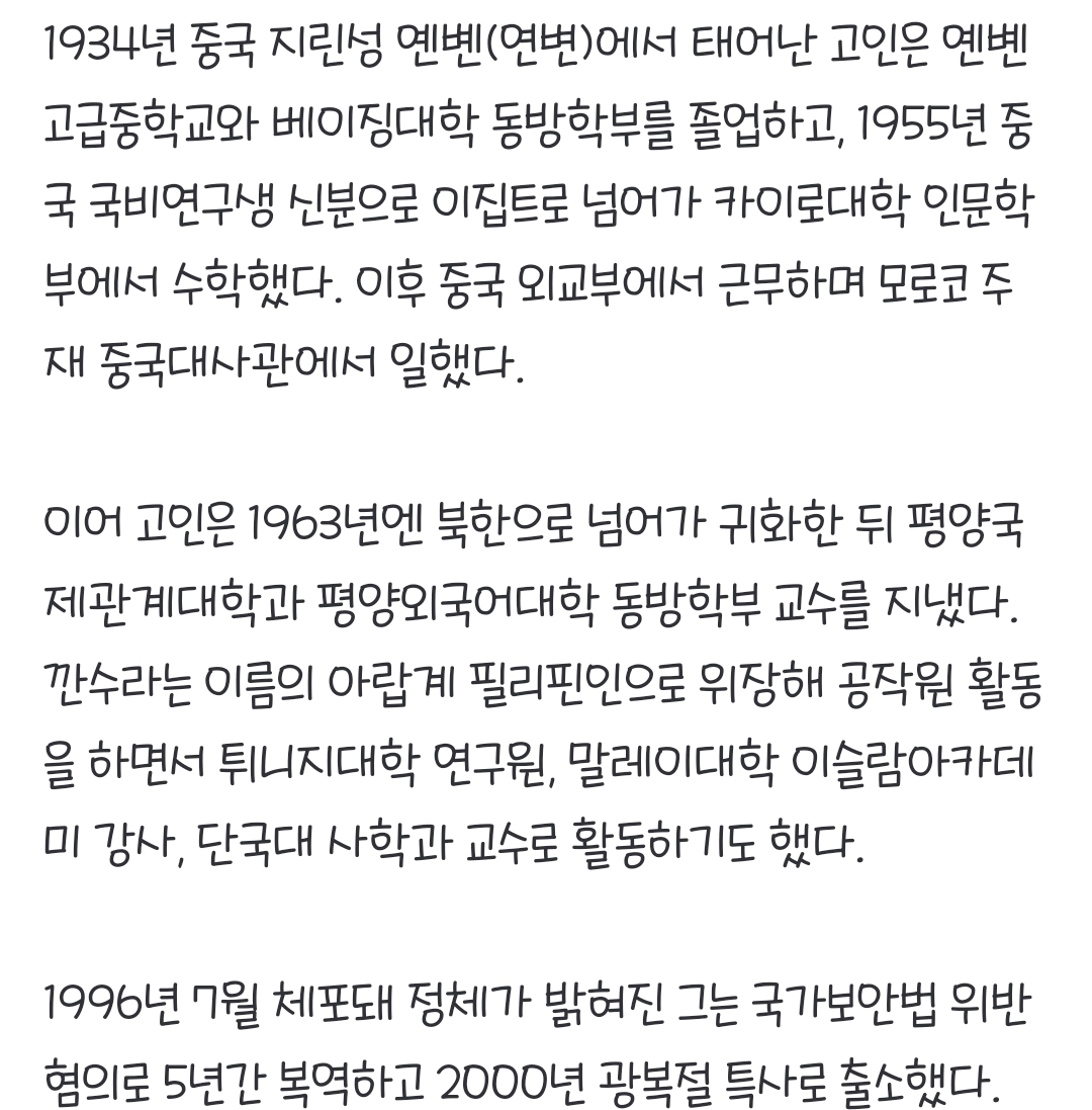 *여성시대* 차분한 20대들의 알흠다운 공간 [여시뉴스데스크]'위장간첩 무함마드 깐수' 정수일 전 교수 별세…향년 91세 작성시간25.02.25|조회수7,542 목록 댓글 4 글자크기 작게가 글자크기 크게가 출처: https://naver.me/5chciBJU'위장간첩 무함마드 깐수' 정수일 전 교수 별세…향년 91세위장간첩 '무함마드 깐수'로 유명한 정수일 한국문명교류연구소장(전 단국대 교수)이 전날인 24일 별세했다. 향년 91세. 1934년 중국 지린성 옌볜(연변)에서 태어난 고인은 옌볜고급중학교와 베이n.news.naver.com 다음검색 현재 게시글 추가 기능 열기 북마크 공유하기 신고 센터로 신고 댓글 4 댓글 리스트 작성시간 25.02.25 헉… 쩌리에서 자주 뵀던 분이시네… 삼가 고인의 명복을 빕니다(글쓴여샤 혹시 캡쳐본에 사용된 폰트 알 수 있을까..?)고마워! 답댓글 작성시간 25.02.25 요거 Aa야옹체 작성시간 25.02.25 와 유명하신 분… 삼가 고인의 명복을 빕니다 작성시간 25.02.25 삼가 고인의 명복을 빕니다 카페 방문해 더 많은 댓글 만나기!