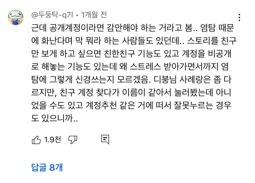 [스크랩] [흥미돋]인스타 염탐 댓글 공감된다vs안된다 작성자루비양|작성시간25.02.28|조회수27,443 목록 댓글 197 글자크기 작게가 글자크기 크게가 다음검색 스크랩 원문 : 쭉빵카페 현재 게시글 추가 기능 열기 북마크 공유하기 신고 센터로 신고 댓글 댓글 197 댓글쓰기 답글쓰기 댓글 리스트 작성자럭키비키 내 좌우명 | 작성시간 25.03.01 염탐ㅋㅋㅋㅋㅋㅋ 공개계정에 올려놓고 염탐......? 작성자슬슬발시리다 | 작성시간 25.03.01 비공을해 ㅋㅋ 공개해놓고 사람들이 보고가면 짜증내 ㅋㅋ웃기네 작성자pdddoddo | 작성시간 25.03.02 맞아ㅋㅋㅋㅋㅋㅋ염탐이라고 하는게 모순이다 작성자드래곤에이지솔라스 | 작성시간 25.03.02 공개가 뭔 염탐이여ㅋㅋㅋ 작성자쁘나이어 | 작성시간 25.03.02 ㅋㅋㅋㅋㅋㅋ 댓글 전체보기