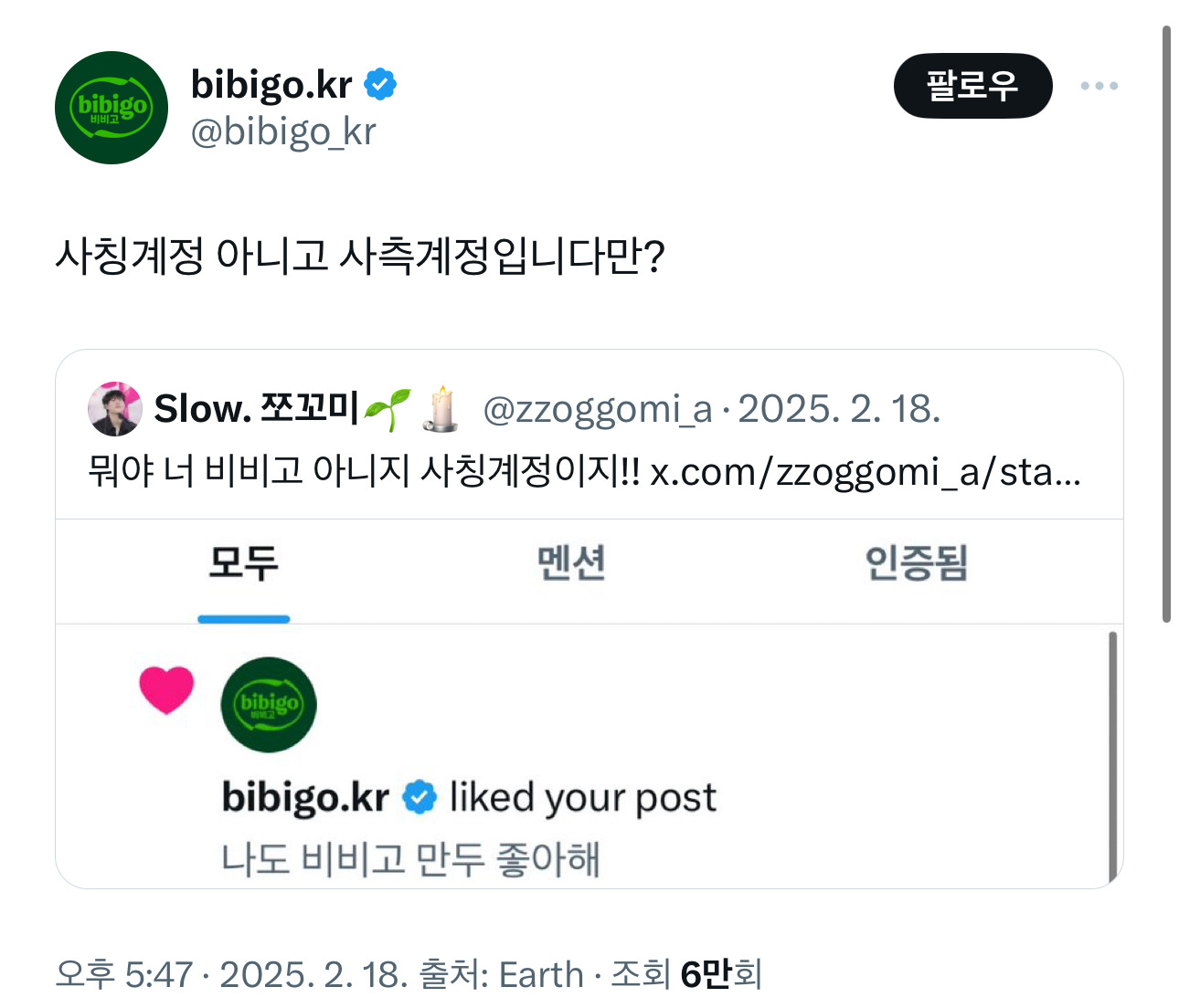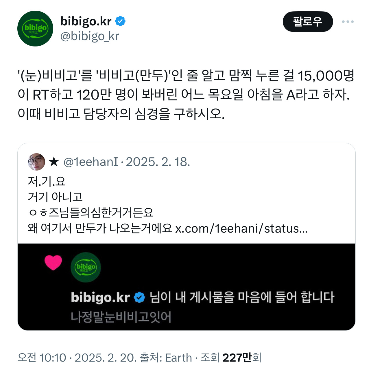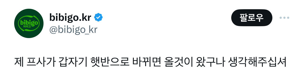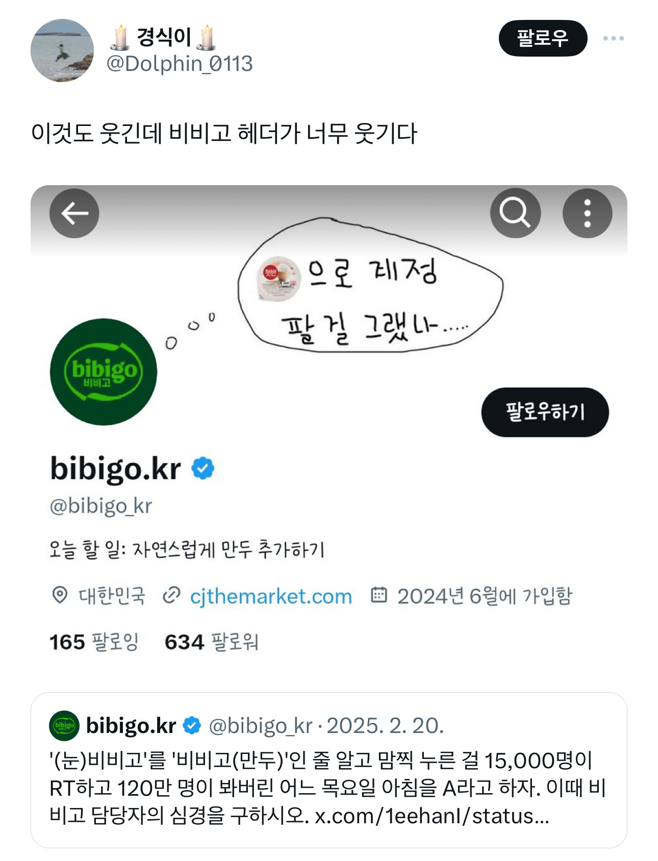 [흥미돋]비비고 트윗 담당자의 고민.twt 작성자나프탈렌향|작성시간25.02.28|조회수69,287 목록 댓글 38 글자크기 작게가 글자크기 크게가 출처: 여성시대 나프탈렌향https://x.com/bibigo_kr/status/1891735197386747915?s=46&t=v7QMmEln8v7WsADFKYn65g 다음검색 현재 게시글 추가 기능 열기 북마크 공유하기 신고 센터로 신고 댓글 댓글 38 댓글쓰기 답글쓰기 댓글 리스트 작성자웩져임다 | 작성시간 25.02.28 담당자도 눈비비고잇엇을듯 작성자주민진 | 작성시간 25.02.28 사측계정ㅋㅋㅋㅋㅋㅋㅋㅋㅋㅋㅋㅋㅋㅋㅋ 작성자체력끌어다쓰기 | 작성시간 25.02.28 사측계정ㅋㅋㅋㅋㅋㅋㅋㅋㅋㅋㅋㅋㅋㅋㅋㅋㅋㅋ 작성자로또킹21번째1등35억 | 작성시간 25.02.28 귀여워 ㅋㅋㅋㅋ 작성자경찰633 | 작성시간 25.02.28 햇반은 왜??! 댓글 전체보기