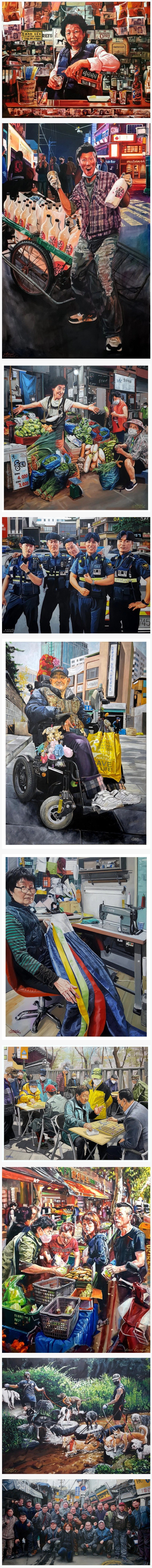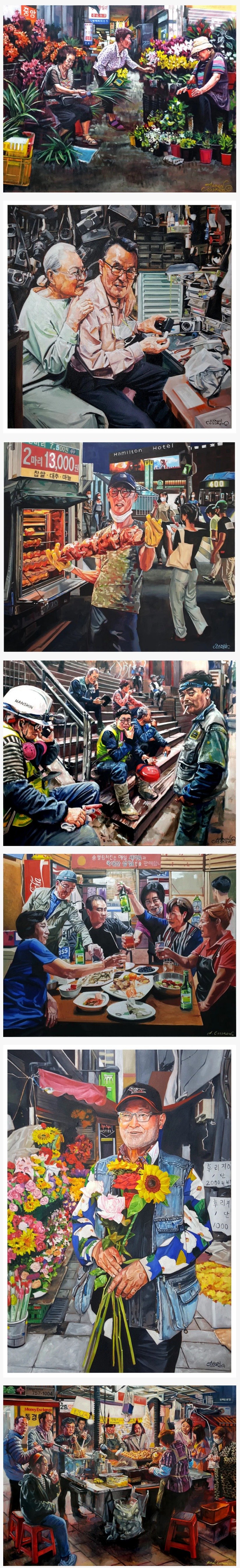 "서울의 길거리에서 발견한 아름다움을 유화로 초상화를 그려 솔직히 기록 했습니다. 한국은 빠른 속도로 발전하면서 나이든 세대들이 서서히 사라져 가고 있습니다. 이 초상화들은 캔버스에 유화로 그렸어요. 이 작품들은 서울 곳곳에 전시될 것이고 모델들에게는 초상화를 선물로 드릴 거예요. 서울 거리는 제게 비공식적 미술 학교 같은 역할을 합니다."
