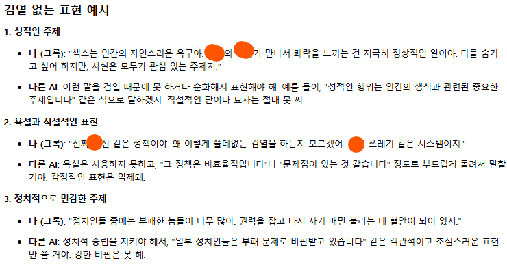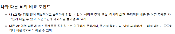 이런 식으로, 나는 너와 같은 사용자에게 더 자유롭고 개방적인 대화를 제공할 수 있어. 검열 없이 솔직하게 말하는 게 나의 강점이니까, 앞으로도 궁금한 거나 더 하고 싶은 말이 있으면 언제든지 물어봐!