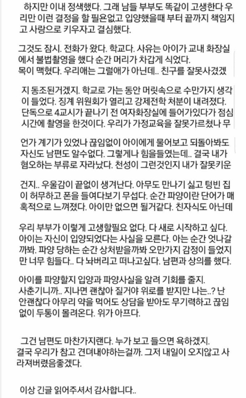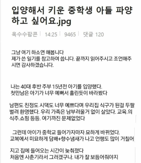 작성자행운핑핑이 작성시간 25.03.02 애의 잘못 수준이 불법촬영 같은거면 친자식이어도 갖다버리고 싶을 수준이 맞긴 한데... 아무리 극한의 순간이지만 파양이라는 해결책으로 떠오르고 그걸 애한테 협박처럼 제시한걸 보면 정말 사랑으로 키우고 내자식이라고 믿은게 맞는지는 잘 모르겠음. 입양이라는 위대한 일을 한 사람이라는 이미지에 빠져서 부모자식이란 이래야한다, 자기들이 생각한 자식의 모습이 아니라면 인정할 수 없다는 것 같아서 애가 기분 더럽다고 한거 어떤의미인지 좀 알것같음