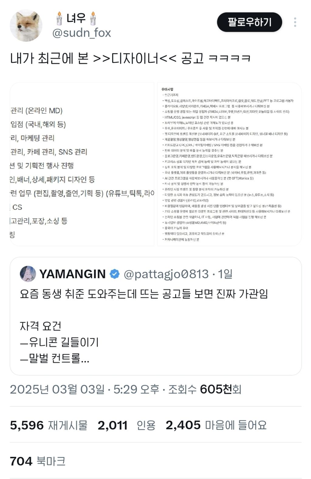 [흥미돋]내가 최근에 본 >>디자이너<< 공고 ㅋㅋㅋㅋ 작성자이굴루|작성시간25.03.04|조회수65,060 목록 댓글 60 글자크기 작게가 글자크기 크게가 출처: https://x.com/sudn_fox/status/1896478081847787811?s=19 다음검색 현재 게시글 추가 기능 열기 북마크 공유하기 신고 센터로 신고 댓글 댓글 60 댓글쓰기 답글쓰기 댓글 리스트 작성자짤이몽땅 | 작성시간 25.03.04 저럴꺼면 사업해야하는거 아냐? 작성자매디페레즈 | 작성시간 25.03.04 저러고 월급 한 2500만원 주면 되는데 ㅅㅂ 작성자연금술사 | 작성시간 25.03.04 놀라우신가요? 현실입니다.. 작성자버거운 | 작성시간 25.03.04 진짜 꺼졌으면 작성자눈앞긁을때인중늘리는사람 | 작성시간 25.03.04 저지랄하고 스톡옵션 ㅇㅈㄹ하고있네 댓글 전체보기