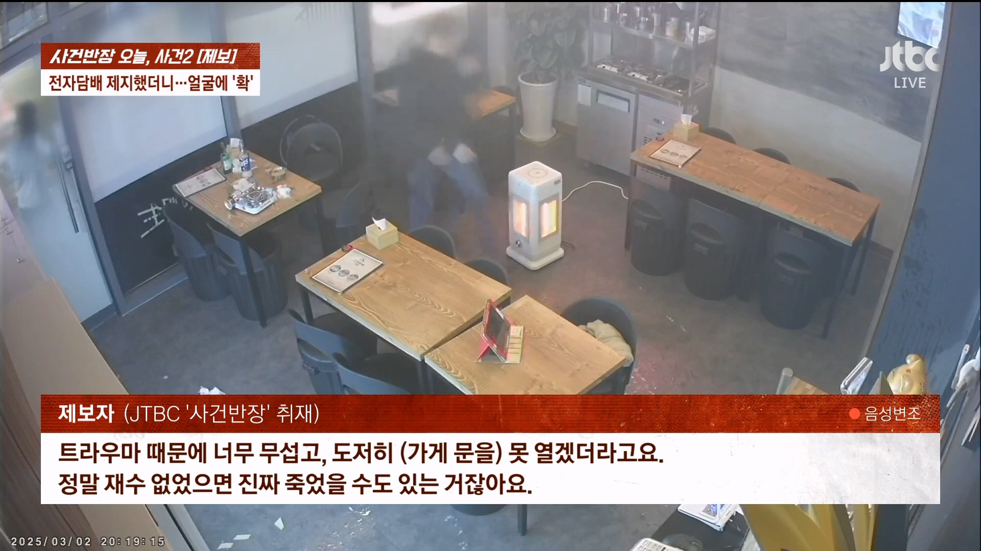 [기타]가게에서 전자담배 피길래 제지했더니 사장에게 술,어묵탕 뿌린 남성 작성자mmln|작성시간25.03.05|조회수3,753 목록 댓글 25 글자크기 작게가 글자크기 크게가 출처: 여성시대 mmln 다행히 손으로 막아서 얼굴에는 닿지 않았고 결국 나가서 경찰에 신고함 3분만에 경찰 도착했지만 남성은 뒷문으로 도망감 다음검색 현재 게시글 추가 기능 열기 북마크 공유하기 신고 센터로 신고 댓글 댓글 25 댓글쓰기 답글쓰기 댓글 리스트 작성자2025년4월4일 윤석열이 죽었음다-.- | 작성시간 25.03.05 등싱새끼시발 왜사냐 작성자행복행벅 | 작성시간 25.03.05 도망은 왜 가 병신새끼 작성자새츌발 | 작성시간 25.03.05 헐 미친 니몸에나 쏟아라 작성자잉글리쉬파운드 | 작성시간 25.03.06 꼭 살인미수죄 적용해라 작성자피포포피 | 작성시간 25.03.06 끔찍하다 댓글 전체보기