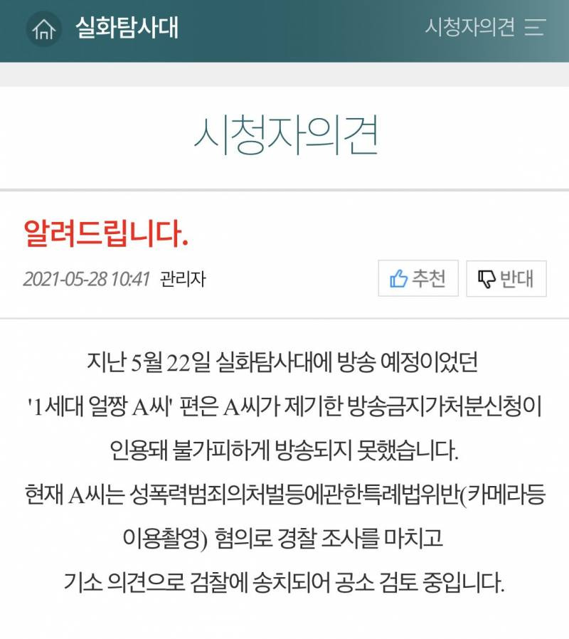 성폭행 범죄의 처벌등에 관한 특례법 위반 (카메라등 이용 촬영) 혐의로 경찰 조사받고 기소의견으로 검찰에 송치되어 공소 검토중 이라고 뜸