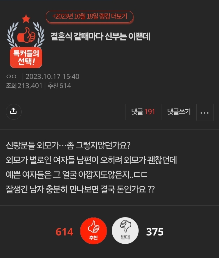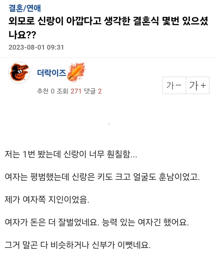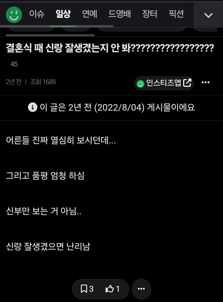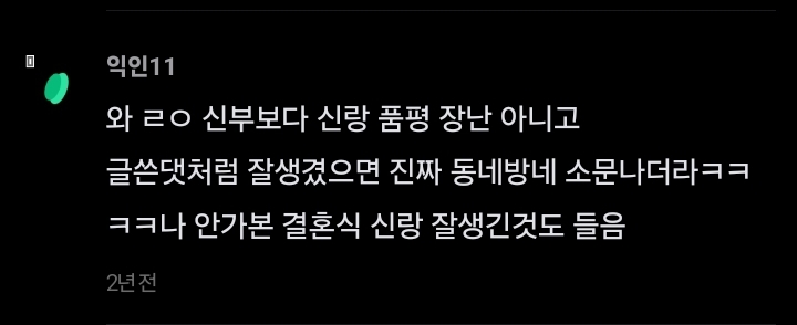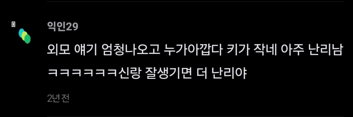 작성자의리의요정 작성시간 25.03.06 옛날 팀장님 얼굴 걍 그랬는데 키 ㅈㄴ 컸거든 그니까 주변 어르신들 다 신랑 훤칠하다고 겁나 얘기함ㅋㅋㅋㅋ