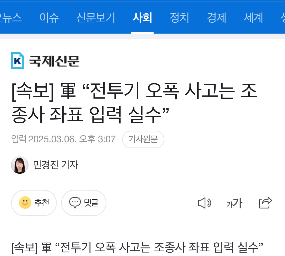 [스크랩] [여시뉴스데스크][속보] 軍 “전투기 오폭 사고는 조종사 좌표 입력 실수” 작성자이굴루|작성시간25.03.06|조회수2,419 목록 댓글 19 글자크기 작게가 글자크기 크게가 https://n.news.naver.com/article/658/0000099437?sid=102 다음검색 스크랩 원문 : 도탁스 (DOTAX) 현재 게시글 추가 기능 열기 북마크 공유하기 신고 센터로 신고 댓글 댓글 19 댓글쓰기 답글쓰기 댓글 리스트 작성자눈구경하는고양이 | 작성시간 25.03.06 실수??? 말이 되는 소리인가 작성자물냉하나요 | 작성시간 25.03.06 대체 무슨 정신인지 .. 작성자펫샵다망해라 | 작성시간 25.03.06 실수가 맞아? 이런실수가 가능해? 작성자볼캡볼펜 | 작성시간 25.03.06 미친거아냐 작성자영팔일사 | 작성시간 25.03.06 와 정신 나간거아냐??? 댓글 전체보기