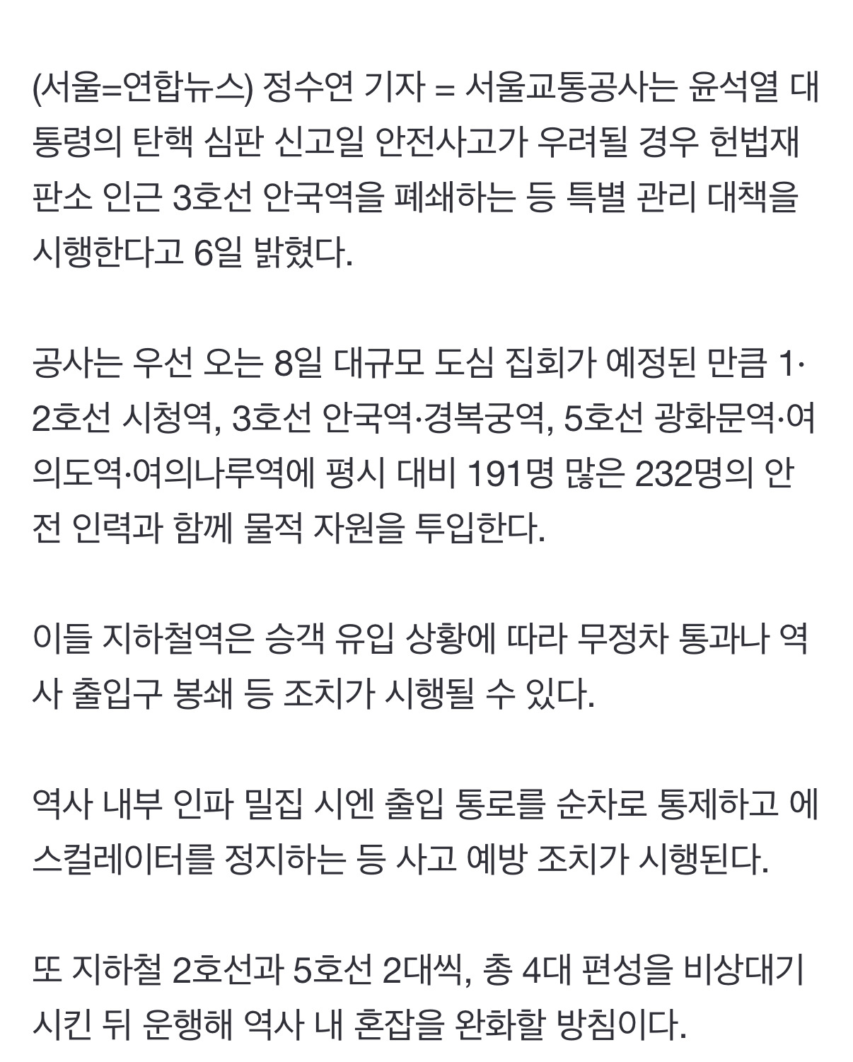 [여시뉴스데스크]尹 탄핵심판 선고 당일, 헌재 인근 3호선 안국역 폐쇄 작성자내란수괴탄핵될때까지안잠|작성시간25.03.06|조회수4,153 목록 댓글 25 글자크기 작게가 글자크기 크게가 출처: https://n.news.naver.com/article/001/0015250225?sid=102尹 탄핵심판 선고 당일, 헌재 인근 3호선 안국역 폐쇄8일 집회 대비 안전인력 증원…서울교통공사 특별관리 대책 시행 서울교통공사는 윤석열 대통령의 탄핵 심판 신고일 안전사고가 우려될 경우 헌법재판소 인근 3호선 안국역을 폐쇄하는 등 특별n.news.naver.com 다음검색 현재 게시글 추가 기능 열기 북마크 공유하기 신고 센터로 신고 댓글 댓글 25 댓글쓰기 답글쓰기 댓글 리스트 작성자윈디웬디 | 작성시간 25.03.06 빨리 시켜 시팔 작성자투명한회색 | 작성시간 25.03.06 칷씌 폐쇄 ㅠ 출근해야돼 꼼짝없이 돌아가게 생겼네 작성자단발여성을보면심장이뜁니다 | 작성시간 25.03.06 파면 파면 작성자엘송합니다 | 작성시간 25.03.07 오늘하자 작성자꼭 합격한다 | 작성시간 25.03.07 빨리해줘 제벌 댓글 전체보기