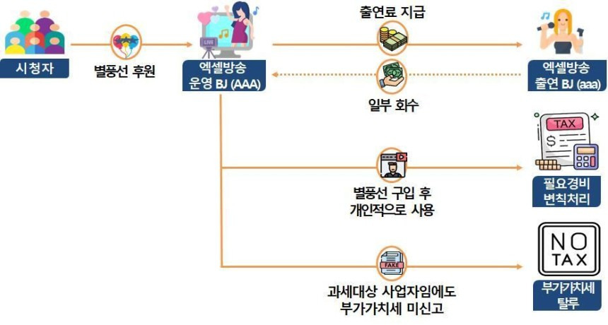 사전 조사 결과 세무조사 대상이 된 엑셀방송 BJ들은 방송 출연 BJ에게 지급한 출연료를 실제 지급한 규모보다 과다 신고한 것으로 나타났다. 출연 BJ에게 출연료로 지급했다가, 이중 일부를 뒷돈으로 되돌려 받기도 했다.