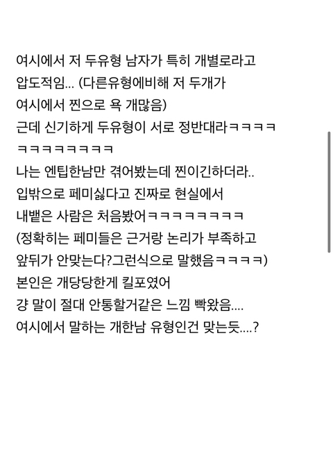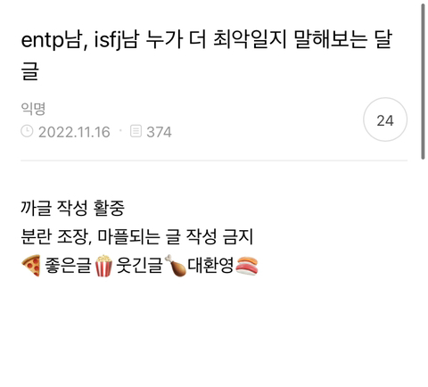 [스크랩] [흥미돋]entp남, isfj남 누가 더 최악일지 말해보는 달글 작성자례뼙|작성시간25.03.06|조회수6,303 목록 댓글 71 글자크기 작게가 글자크기 크게가 출처 : https://m.cafe.daum.net/subdued20club/WFYL/974705?svc=cafeapp모든 이야기의 시작 - Daum 카페매일매일 올라오는 즐거운 카페 이야기m.cafe.daum.net투표마저 비등비등함ㅋㅋㅋㅋㅋㅋㅋㅋㅋㅋㅋㅋㅋㅋㅋ 다음검색 스크랩 원문 : *여성시대* 차분한 20대들의 알흠다운 공간 현재 게시글 추가 기능 열기 북마크 공유하기 신고 센터로 신고 댓글 댓글 71 댓글쓰기 답글쓰기 댓글 리스트 작성자떡만두두구구 | 작성시간 25.03.07 잇프제 정신병 씨게옴 진짜 작성자크츄프 | 작성시간 25.03.13 이분야 잇프제 ㄹㅇ임 작성자푸바오가행복했으면해 | 작성시간 25.03.18 Isfj한테 당한거 그대로 entp한테쓰는중인데 엔팁이발려....잇프제가 정병이여 작성자담밤 | 작성시간 25.03.23 좃프제남 정병제조기 작성자아다음카카오통합진짜짜증나네 | 작성시간 25.04.21 엔팁은 차라리 거를수도 있고 같이 존나 싸울수라도 있는데 isfj는… 댓글 전체보기
