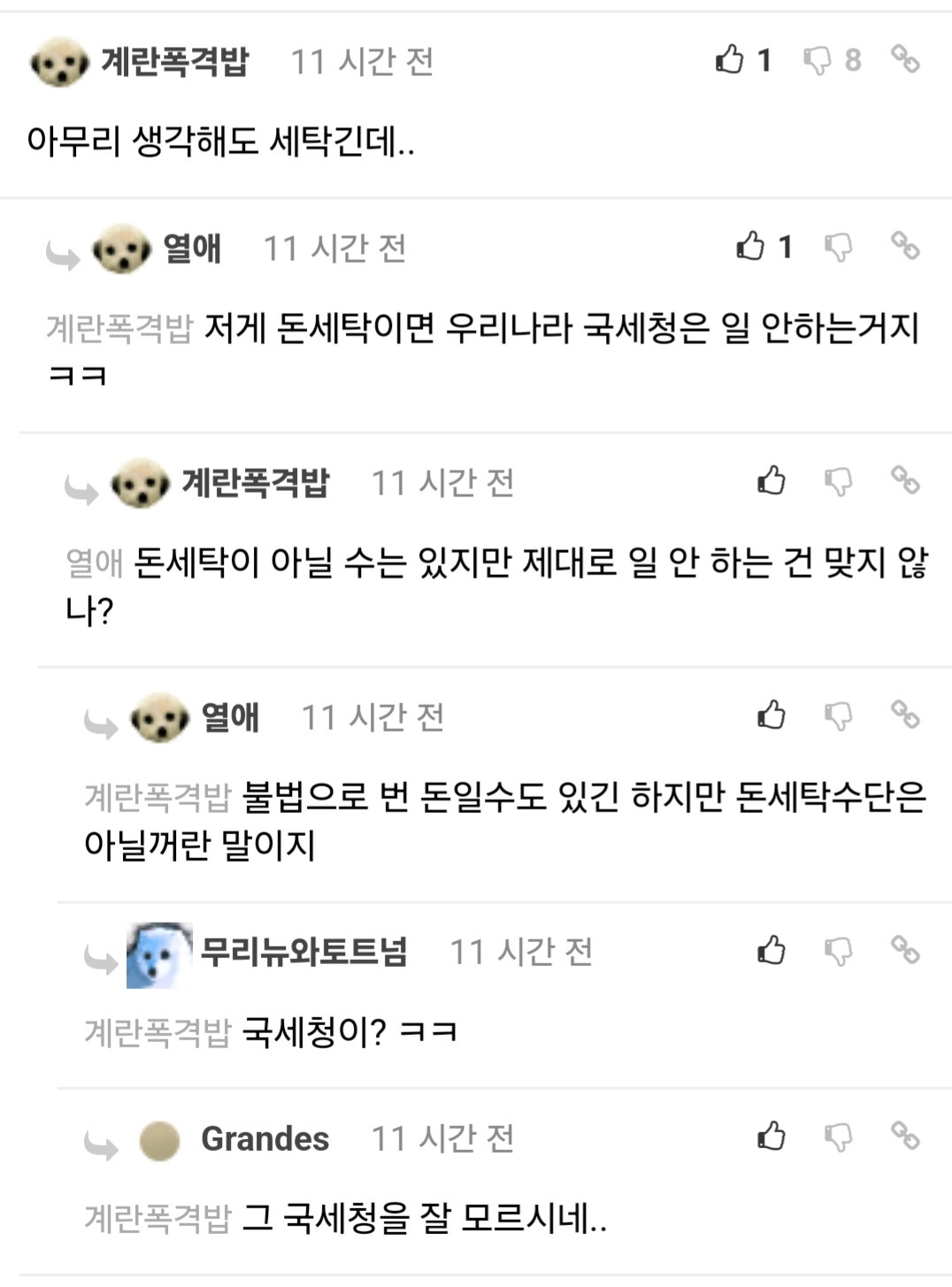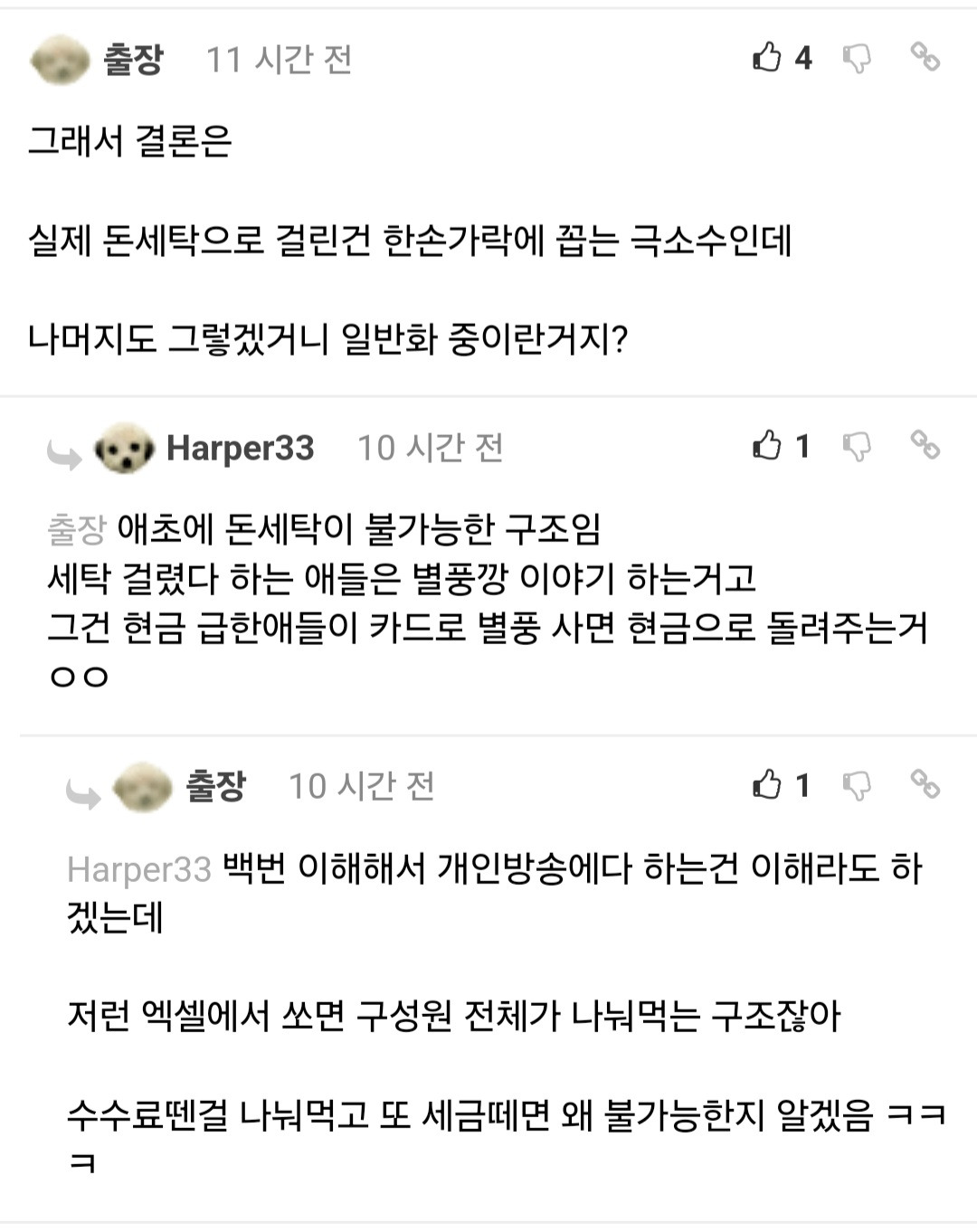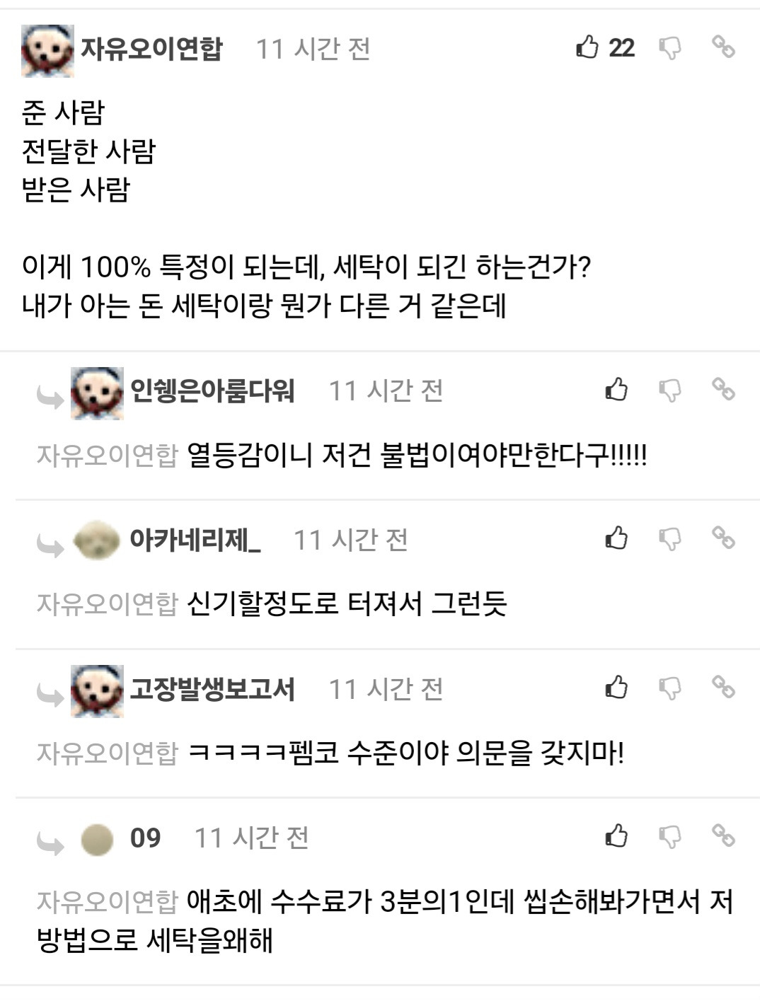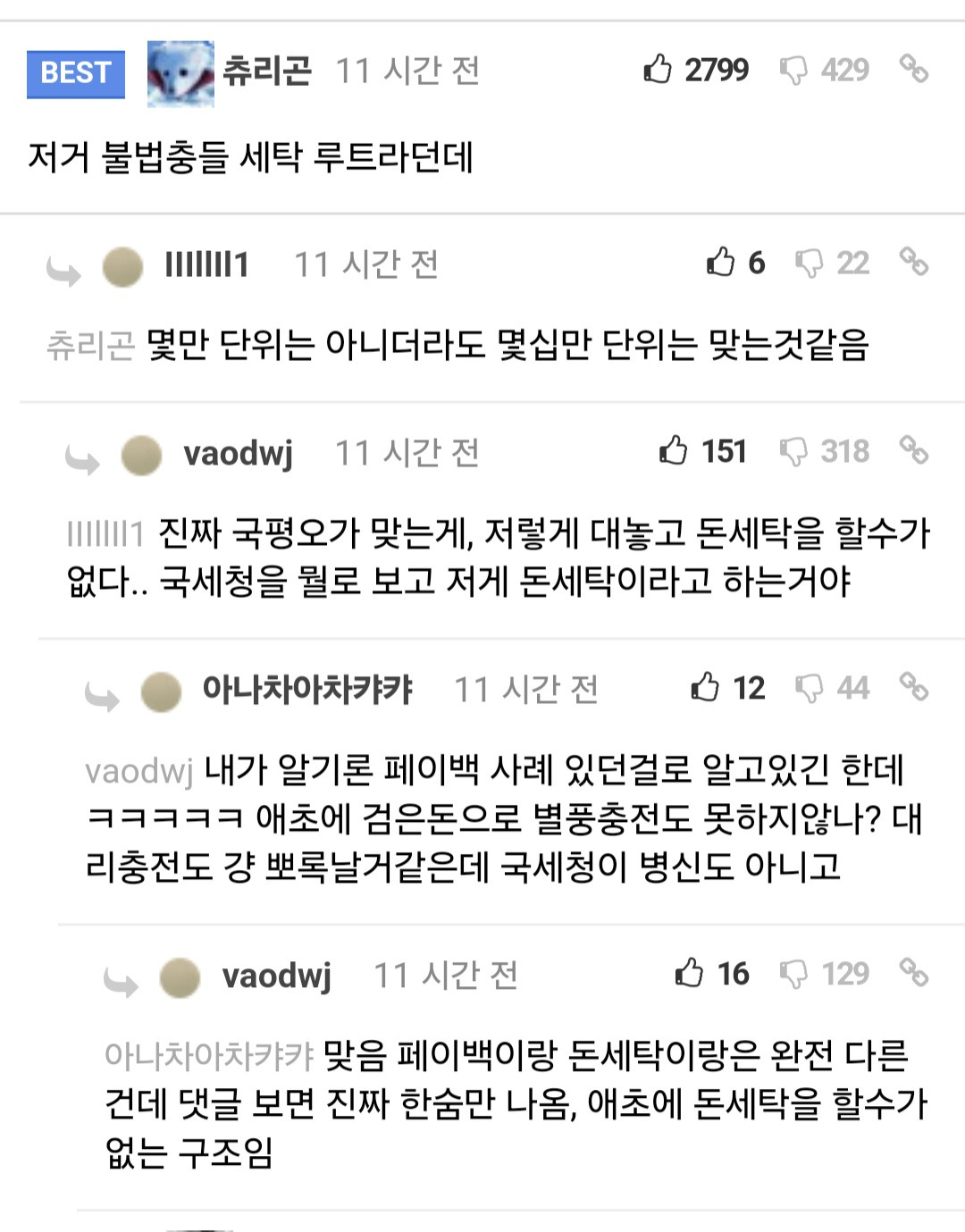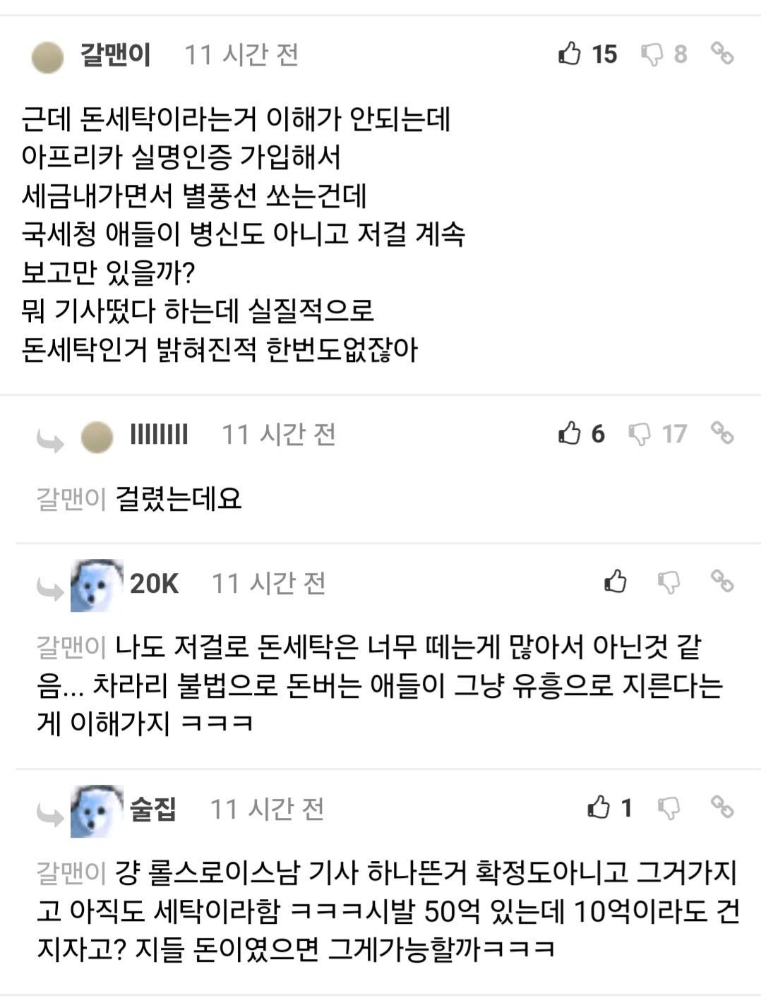 [스크랩] [기타]돈세탁이다 아니다 말나오는 아프리카 엑셀 방송 근황.jpg 작성자개빡쳐|작성시간25.03.07|조회수21,604 목록 댓글 29 글자크기 작게가 글자크기 크게가 출처: 여성시대 악귀별풍선 1개 = 100원별풍선 117만개 쏜 #faker는 아프리카 엑셀방송 큰손이고 프로게이머랑 전혀 상관없는 사람임남초에서 돈세탁이다 vs 국세청이 ㅂㅅ이냐로 갈리는중여캠들 춤추는거 보자고 억단위로 쏘는게 이해안가서 나오는 반응이긴함.. 다음검색 스크랩 원문 : *여성시대* 차분한 20대들의 알흠다운 공간 현재 게시글 추가 기능 열기 북마크 공유하기 신고 센터로 신고 댓글 댓글 29 댓글쓰기 답글쓰기 댓글 리스트 작성자초코초코과자 | 작성시간 25.03.07 저거 남자는 사회보고 여자들이 헐벗고 재주부리는거 보기 싫음. 작성자도다리도달도달 | 작성시간 25.03.07 시발 닉은 또 왜저럼 작성자도룡뇽파 | 작성시간 25.03.07 🤢 작성자부라타치즈샐러드 | 작성시간 25.03.07 안잡는거지 뭐 작성자냥르장머리 | 작성시간 25.03.07 국세청이 바보야? 댓글 전체보기