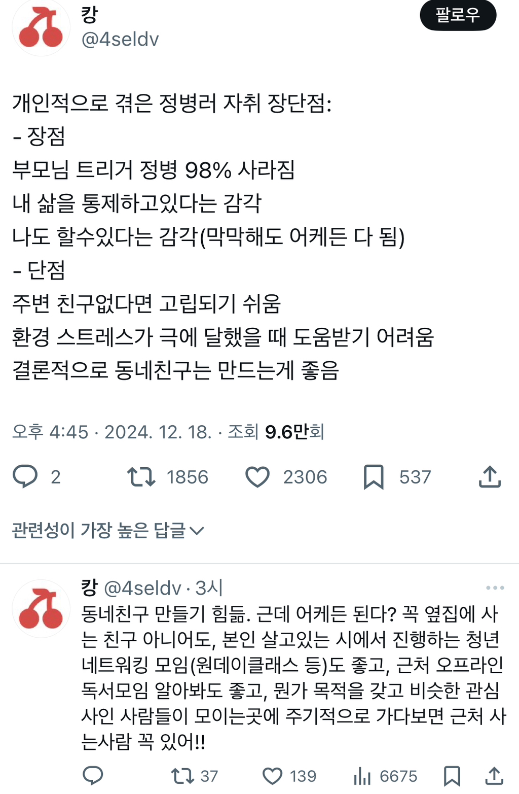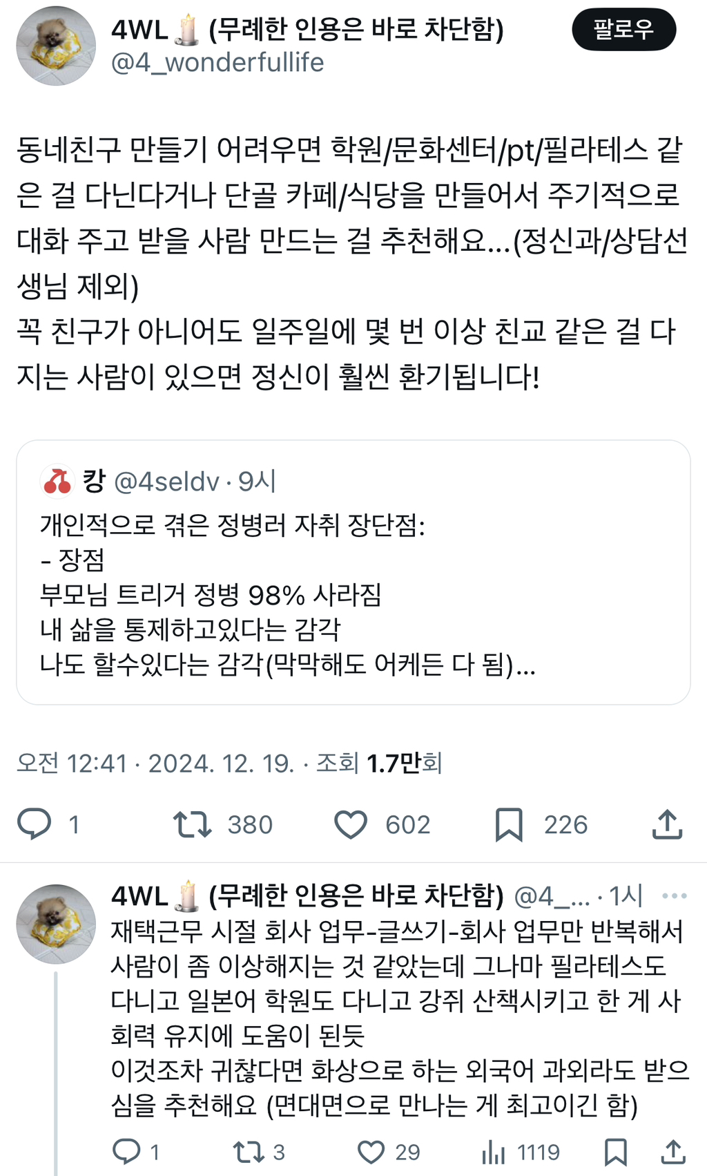 작성자타일붙이기 작성시간 25.03.07 ㅁㅈ 혼자살면 좋긴하지만 고립될 수 있으니 꼭 얕은 관계라도 많이 만들어놔야 하는거같아 특히 동네에서