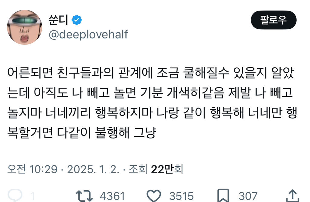 [스크랩] [기타]어른되면 친구들과의 관계에 조금 쿨해질수 있을지 알았는데 아직도 나 빼고 놀면 기분 개색히같음.twt