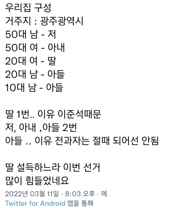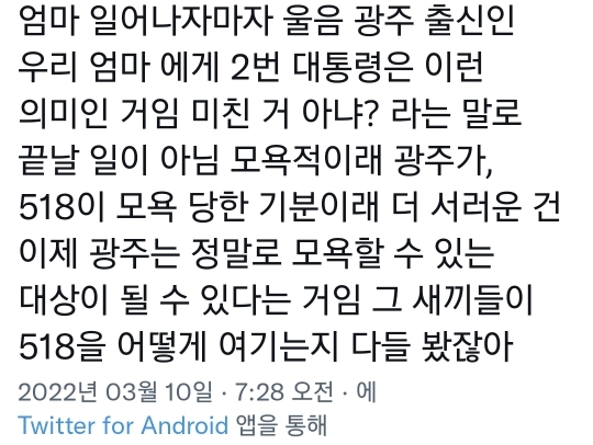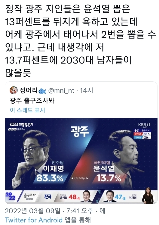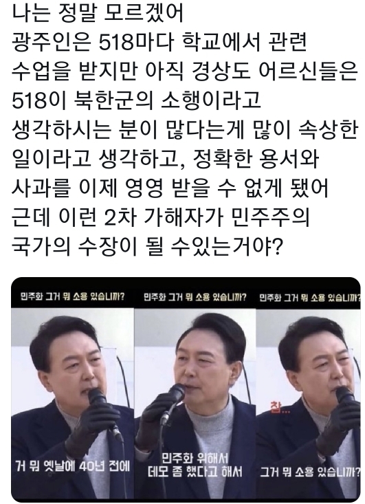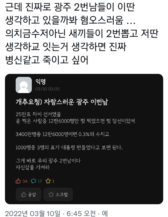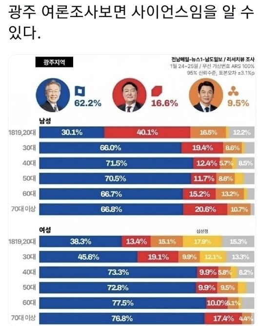 작성자크렘당주 작성시간 25.03.08 ㅇㅇ 2030 광주출신 남자들+봉선동 전문직 2찍 많음. 실제로 윤 뽑은 의사들 많이봤고(근데 의대증원으로 난리났죠?) 다들 민주당이 광주에 해준게 뭐있냐고 하면서 찍은거 맞음. 내가 설득하다가 실패함. 돈이 더 중요한사람들은 설득 안되더라. 물론 2030남자들은 답없고.