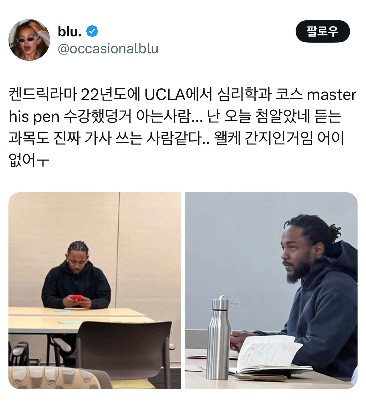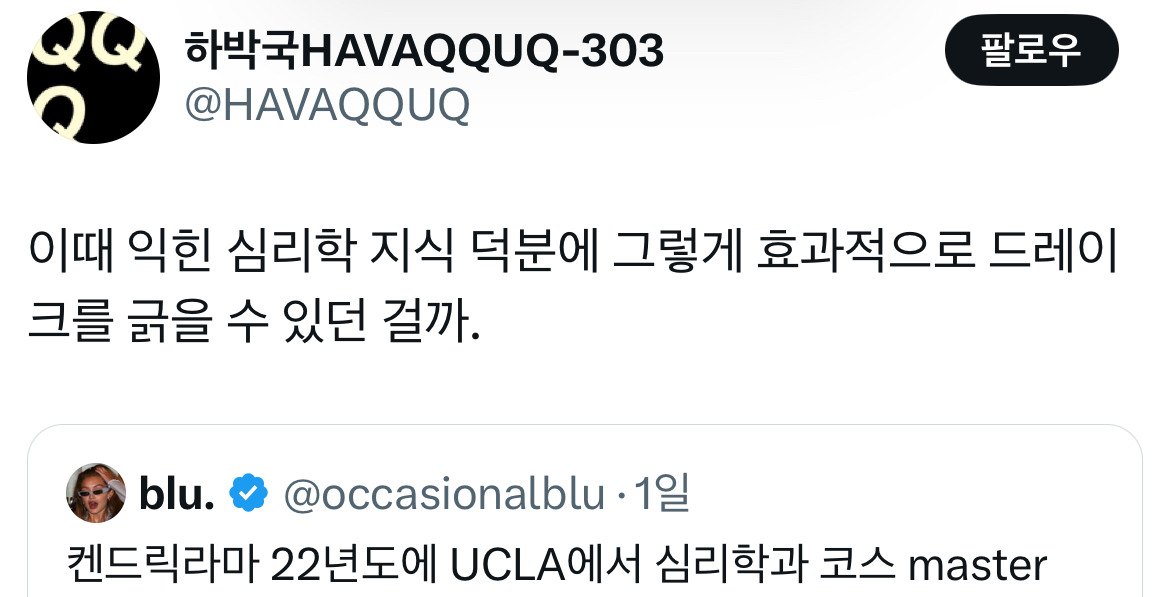 [스크랩] [흥미돋]켄드릭라마 22년도에 UCLA에서 심리학과 코스 수강했던 거 아는 사람.twt 작성자꽃아래별|작성시간25.03.07|조회수6,655 목록 댓글 6 글자크기 작게가 글자크기 크게가 출처: https://x.com/occasionalblu/status/1894907264080978132?s=46&t=Ubli_gnZh_-8ygJj650pCg ㅋㅋㅋㅋㅋㅋㅋ 다음검색 스크랩 원문 : *여성시대* 차분한 20대들의 알흠다운 공간 현재 게시글 추가 기능 열기 북마크 공유하기 신고 센터로 신고 댓글 댓글 6 댓글쓰기 답글쓰기 댓글 리스트 작성자스트레칭 꼭 하자 | 작성시간 25.03.07 meet the grahams는 진짜 사람 속 긁는 논문급 아니냐고 작성자집에보내주시면안될까요? | 작성시간 25.03.08 데잇낫라잌어스~~데잇낫라잌어스~~ 작성자싸와디칵 | 작성시간 25.03.08 왑왑왑왑왑 작성자시브럴것 | 작성시간 25.03.08 헐드레이크 그드레이크?언제죽었댜.. 작성자YOUTHy | 작성시간 25.03.08 에이 마이너~~~ 댓글 전체보기