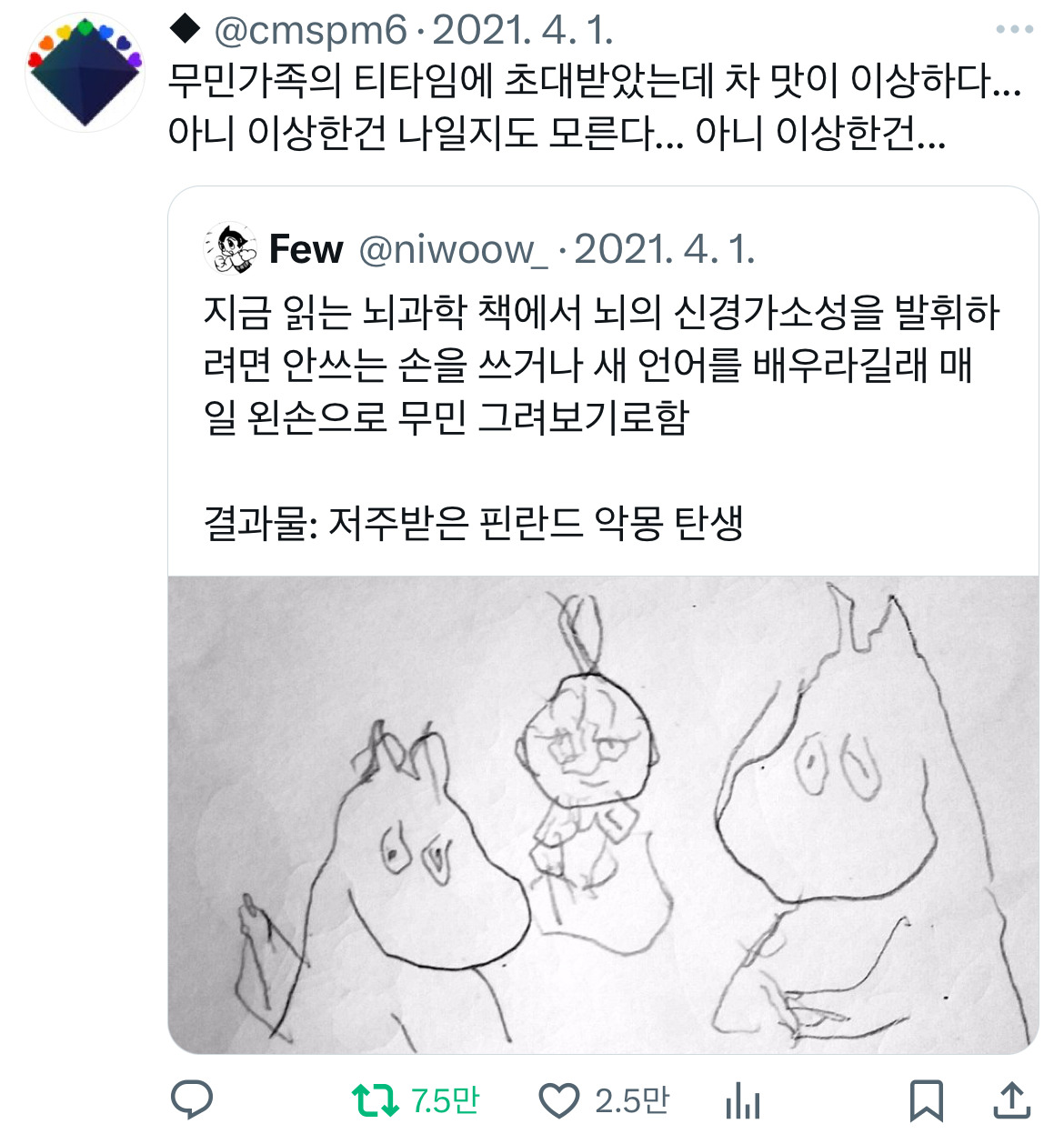 [스크랩] [흥미돋]뇌과학 책에서 뇌의 신경가소성을 발휘하려면 안쓰는 손을 쓰거나 새 언어를 배우라길래 매일 왼손으로 무민 그려보기로 함.twt 작성자헬로월|작성시간25.03.07|조회수16,782 목록 댓글 3 글자크기 작게가 글자크기 크게가 출처: https://x.com/cmspm6/status/1377496545377980419?s=46&t=Ubli_gnZh_-8ygJj650pCg ㅋㅋㅋㅋㅋㅋㅋㅋㅋ 다음검색 스크랩 원문 : *여성시대* 차분한 20대들의 알흠다운 공간 현재 게시글 추가 기능 열기 북마크 공유하기 신고 센터로 신고 댓글 댓글 3 댓글쓰기 답글쓰기 댓글 리스트 작성자포카칩1등생감자 | 작성시간 25.03.07 근데디게잘그렷닼ㅋㅋㅋㅋㅋㅋㅋㅋㅋㅋㅋ 작성자꼬갸 | 작성시간 25.03.07 ㅋㅋㅋㅋㅋㅋ 작성자New kids on the block | 작성시간 25.03.07 느좋ㅋㅋㅋㅋㅋㅋㅋ 댓글 전체보기