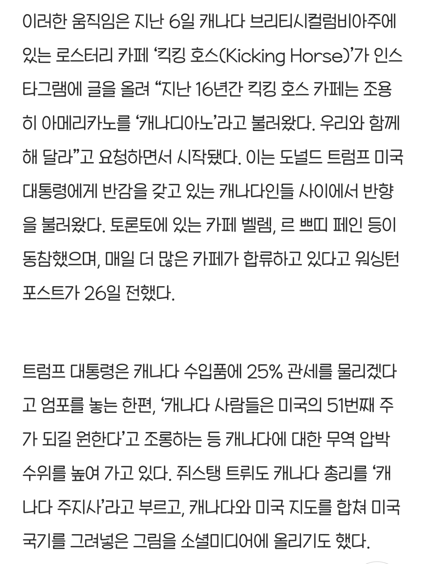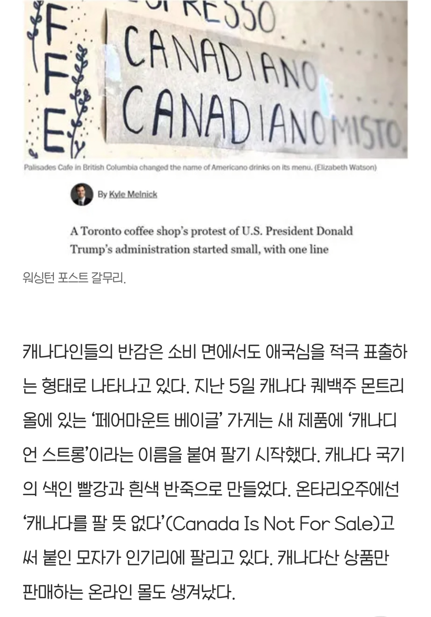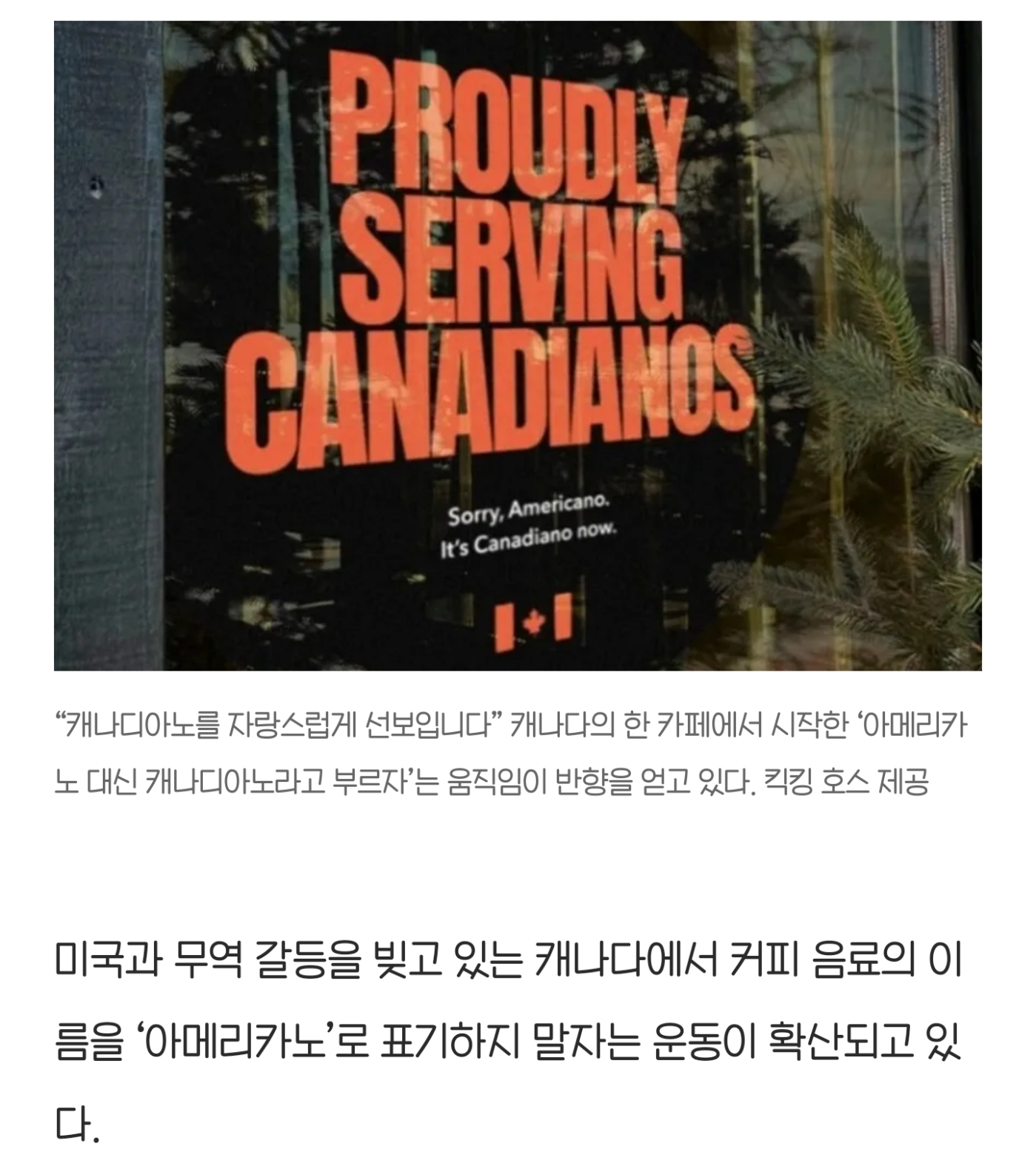 [여시뉴스데스크]“아메리카노 말고 캐나디아노” 트럼프가 바꾼 커피 이름 작성자어이김또깡|작성시간25.03.08|조회수4,243 목록 댓글 14 글자크기 작게가 글자크기 크게가 출처: https://naver.me/IGJXyzrb“아메리카노 말고 캐나디아노” 트럼프가 바꾼 커피 이름미국과 무역 갈등을 빚고 있는 캐나다에서 커피 음료의 이름을 ‘아메리카노’로 표기하지 말자는 운동이 확산되고 있다. 이러한 움직임은 지난 6일 캐나다 브리티시컬럼비아주에 있는 로스터www.hani.co.kr 다음검색 현재 게시글 추가 기능 열기 북마크 공유하기 신고 센터로 신고 댓글 댓글 14 댓글쓰기 답글쓰기 댓글 리스트 작성자지도표성경녹차김 | 작성시간 25.03.08 아아는 코리아노가 맞다고 생각ㅋㅋㅋㅋㅋ 작성자고로로로로롤 | 작성시간 25.03.08 ㅋㅋㅋㅋㅋㅋㅋㅋㅋ 작성자애슐리에서환갑잔치 | 작성시간 25.03.08 아코 뜨코~ 작성자커피한잔할래여오오어 | 작성시간 25.03.08 ㅋㅋㅋㅋㅋㅋㅋㅋ괜찮네 작성자포풍 | 작성시간 25.03.08 응원합니다 댓글 전체보기