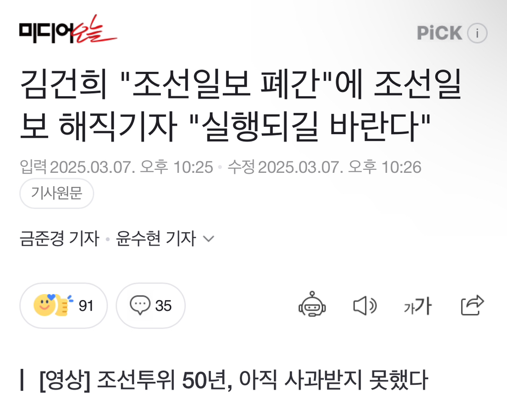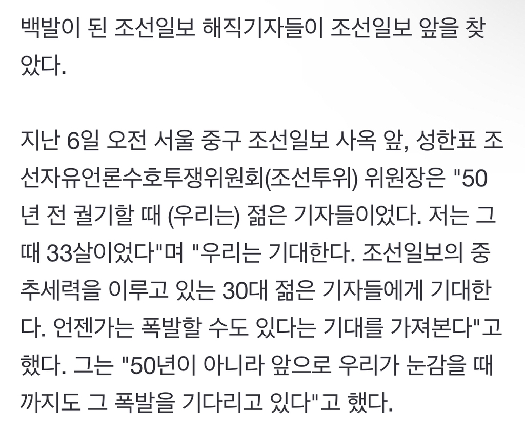 [여시뉴스데스크]김건희 "조선일보 폐간"에 조선일보 해직기자 "실행되길 바란다" 작성자소리앙|작성시간25.03.08|조회수908 목록 댓글 1 글자크기 작게가 글자크기 크게가 출처: https://naver.me/5OQ72LMf김건희 "조선일보 폐간"에 조선일보 해직기자 "실행되길 바란다"백발이 된 조선일보 해직기자들이 조선일보 앞을 찾았다. 지난 6일 오전 서울 중구 조선일보 사옥 앞, 성한표 조선자유언론수호투쟁위원회(조선투위) 위원장은 "50년 전 궐기할 때 (우리는) 젊은 n.news.naver.com전문출처 다음검색 현재 게시글 추가 기능 열기 북마크 공유하기 신고 센터로 신고 댓글 댓글 1 댓글쓰기 답글쓰기 댓글 리스트 작성자제알갈 | 작성시간 25.03.08 1975년 3월 박정희 독재정권에 순응했던 조선일보에서 저항하던 기자들은 쫓겨났다. 당시 해고된 32명의 기자들은 끝내 돌아가지 못했고, 아직도 사과받지 못하고 있다. 이들의 자세한 발언은 영상을 통해 볼 수 있다.이렇다네 댓글 전체보기