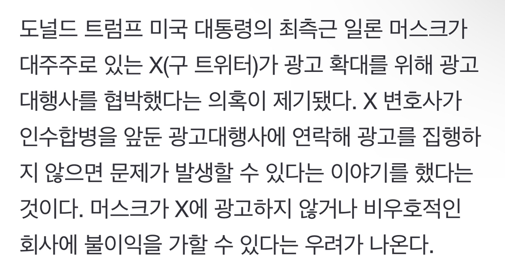 [여시뉴스데스크]트럼프 등에 업은 일론 머스크 X, 광고주 협박 의혹 작성자소리앙|작성시간25.03.08|조회수716 목록 댓글 1 글자크기 작게가 글자크기 크게가 출처: https://naver.me/FsRtLuGW트럼프 등에 업은 일론 머스크 X, 광고주 협박 의혹도널드 트럼프 미국 대통령의 최측근 일론 머스크가 대주주로 있는 X(구 트위터)가 광고 확대를 위해 광고대행사를 협박했다는 의혹이 제기됐다. X 변호사가 인수합병을 앞둔 광고대행사에 연락n.news.naver.com전문출처 다음검색 현재 게시글 추가 기능 열기 북마크 공유하기 신고 센터로 신고 댓글 댓글 1 댓글쓰기 답글쓰기 댓글 리스트 작성자낑깡여시 | 작성시간 25.03.08 가지가지 ㅅㅂ 내돈내놔ㅠ 내 주식 댓글 전체보기