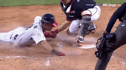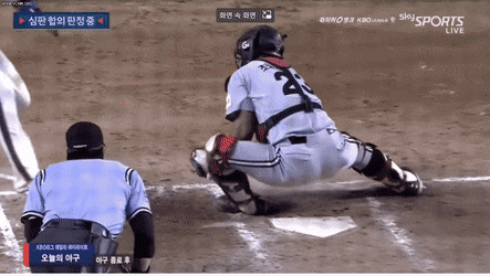 완벽한 아웃타이밍에 포수 피하면서 베이스 터치
