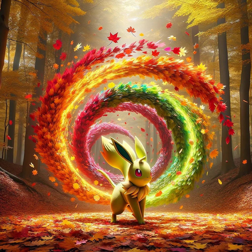 '가을의 힘을 담은 낙엽들이 꼬리 주위로 소용돌이치며 에너지를 발산하는 기술'