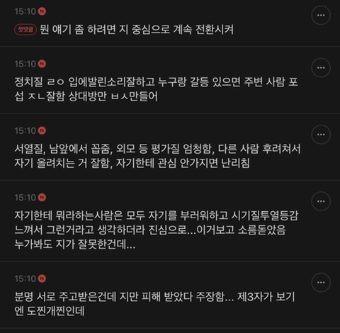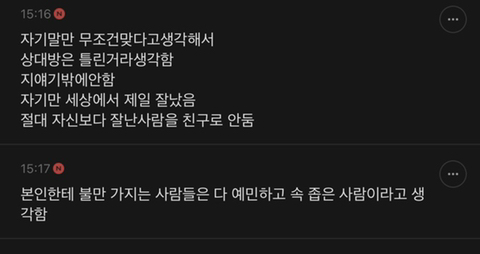 작성자냥르장머리 작성시간 25.03.11 본인의 자존감을 위해 남을 항상 깎아내림