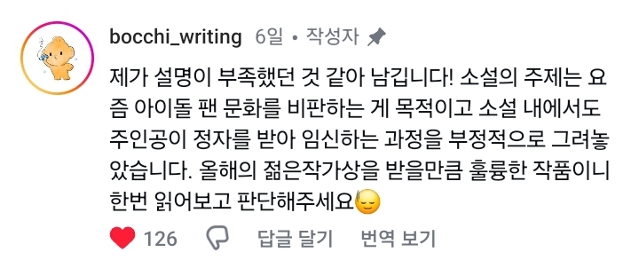 작성자헤이미쉬클렌징밤 작성시간 25.03.28 저 작가분 원래 어떤 아이돌의 엄청난 덕후..였을 거임... 아이돌 사랑하는 팬 소재로 첫 작품 내셨고 글 진짜 잘 썼어 젊은작가상 수상한 글이면 무턱대고 이상한 내용은 아닐테고 저 소재로 뭔가를 말하고자 하는 걸 텐데 무턱대고 비난하는 게 신기하네