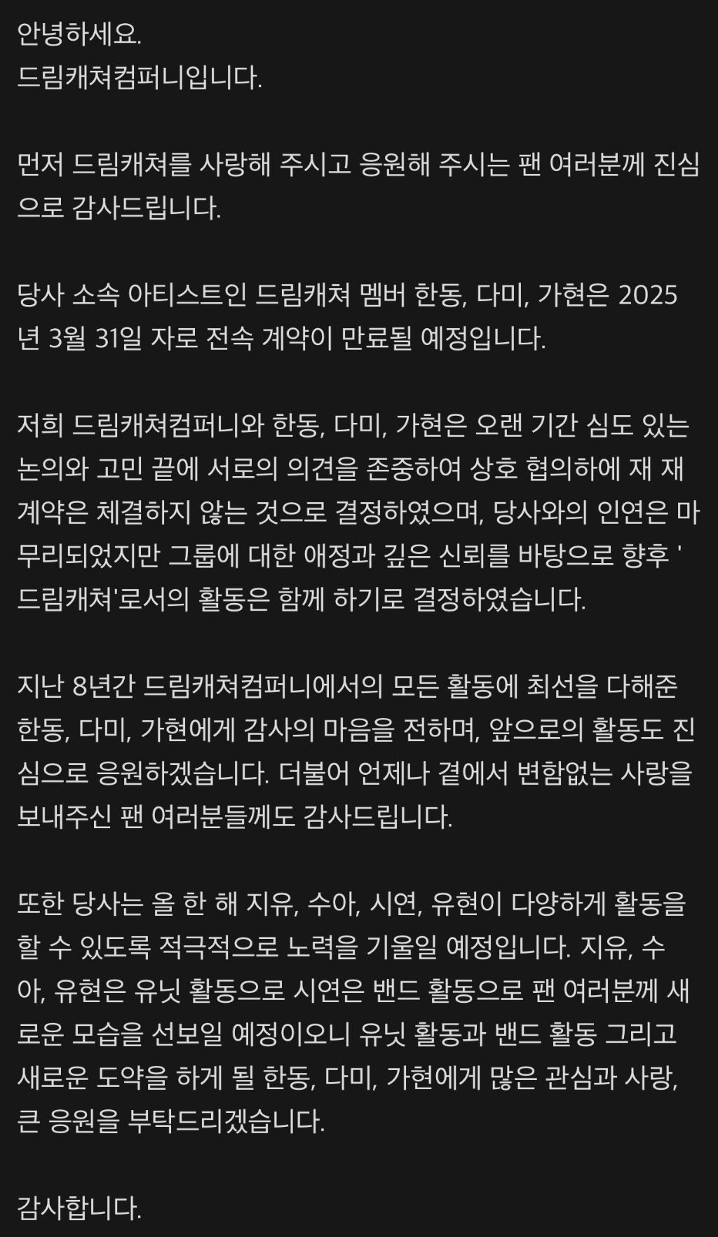 드림캐쳐컴퍼니는 오늘(10일) 공식 입장을 통해 "한동, 다미, 가현과 상호 협의를 거쳐 전속 계약을 연장하지 않기로 결정했다"면서도 "그룹에 대한 애정과 깊은 신뢰를 바탕으로 앞으로도 드림캐쳐 멤버로서 활동을 지속할 예정"이라고 전했다.