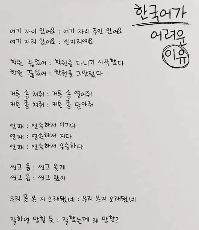 작성자림월드 작성시간 25.03.10 ㅋㅋㅋ 주변에 외국인들 한국어 너무어려워하더랔ㅋㅋㅋㅋ 케이팝 덕질하는 외국인으로 태어나서 눈물흘리며 한국어 존내공부하지않아도 돼서 감사하게 여기며 살고있음