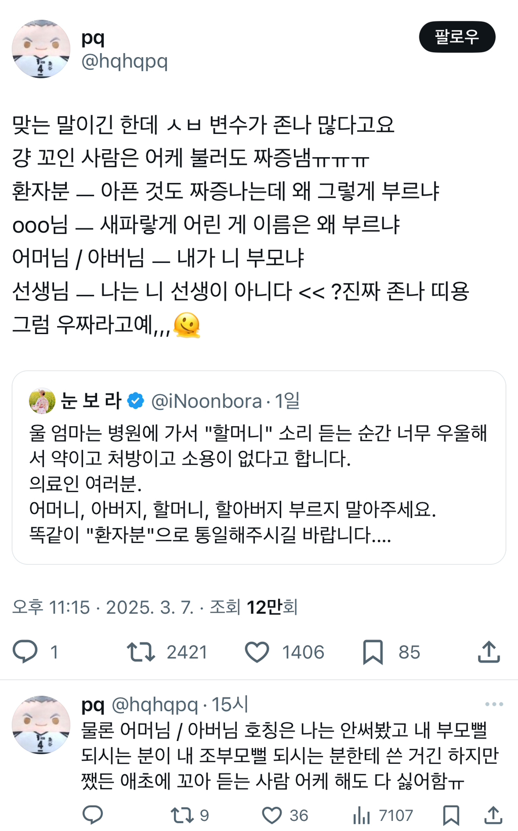 답댓글 작성자냥하리 작성시간 25.03.11 근데 또 환자분이라고 부르는것도 싫어하는 사람 있는데 걍 ㅇㅇㅇ님 부르면 서로 편함