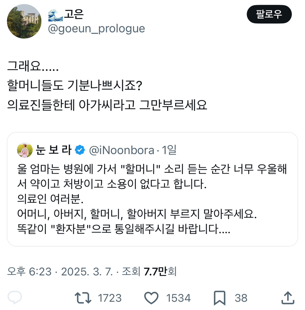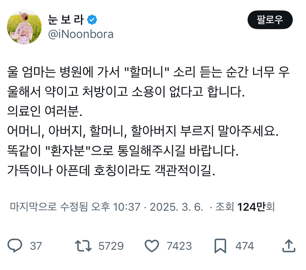 호칭때문에 환자한분이 같이 일하는 쌤한테 내가 왜 당신 어머님이냐고 뭐라고 했던거 보고 더더욱 그러면 안된다 싶었음 ㅋㅋ...누가 나한테 아가씨 언니 이러는거 기분나쁘잖아 똑같은거야 -