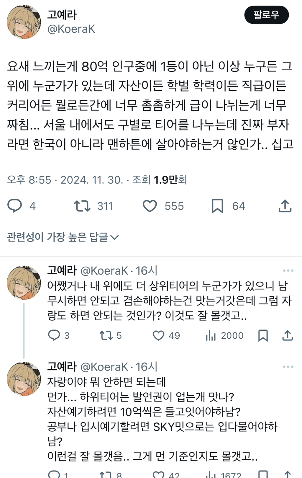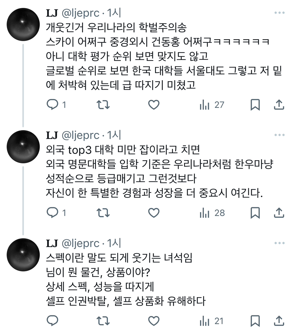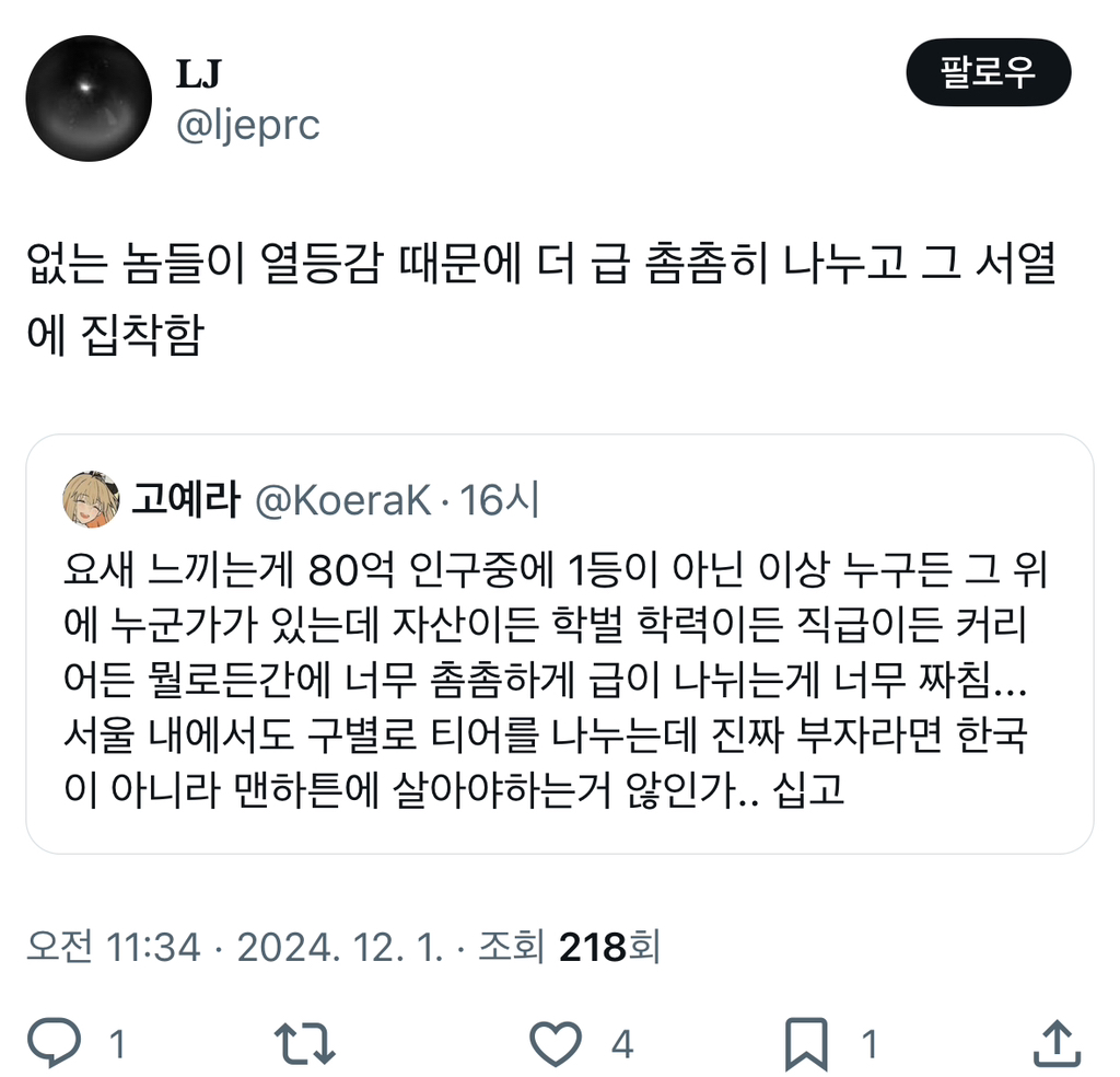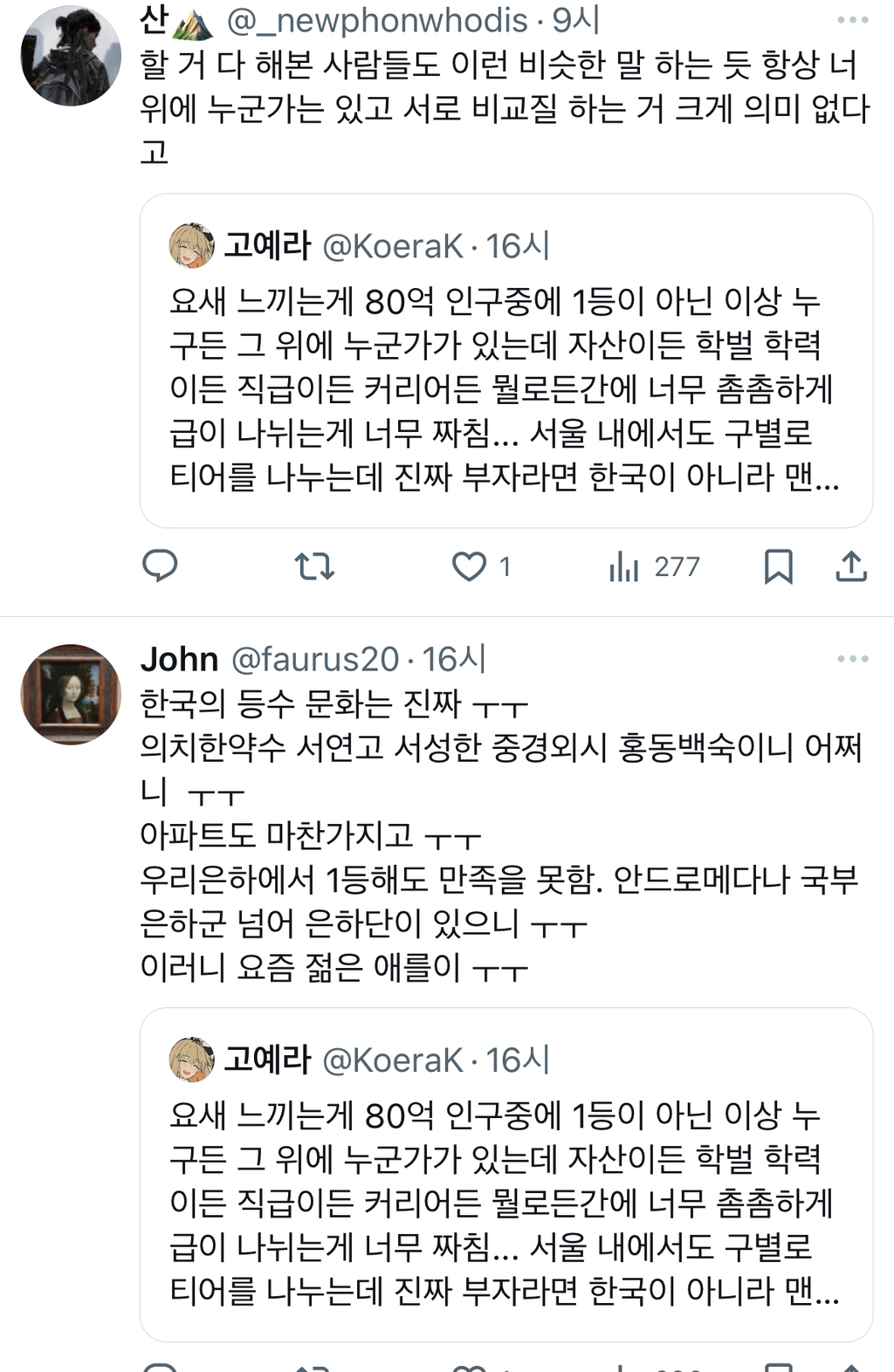 [스크랩] [기타]1등이 아닌 이상 누구든 그 위에 누군가가 있는데 자산이든 학벌 학력이든 직급이든 커리어든 뭘로든간에 너무 촘촘하게 급이.twt